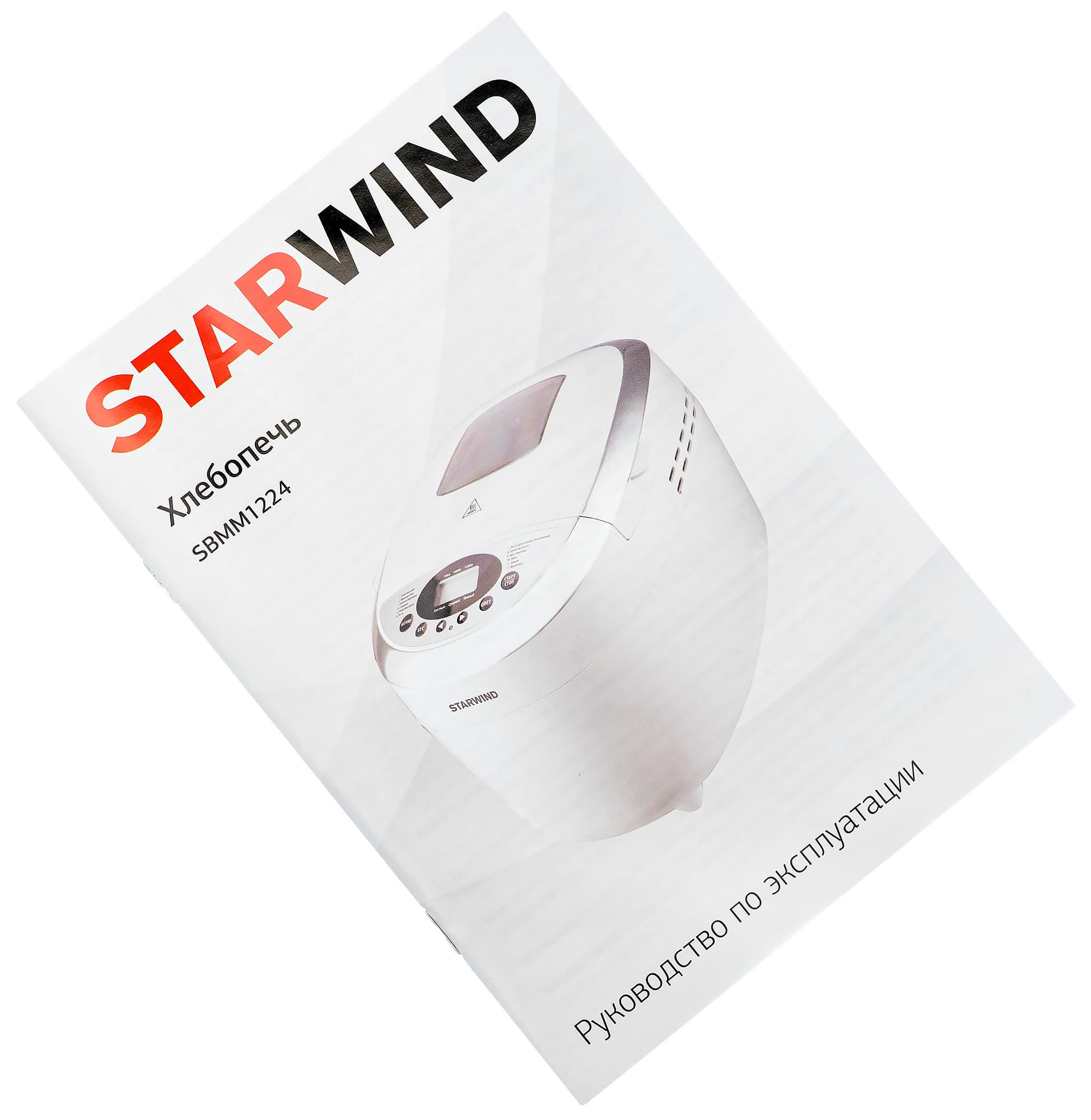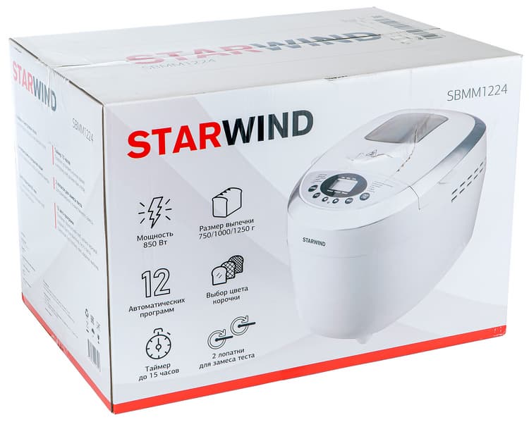 Прибор поставляется в коробке, соответствующей его габаритам. Оформление спокойное, можно даже назвать его чистым: на белом фоне размещена фотография устройства, рядом — пиктограммы функций. На боковой стороне можно ознакомиться с достоинствами и особенностями хлебопечи Starwind SBMM1224. Информация на противоположных гранях упаковки повторяется. Никакого приспособления для переноски нет, но и вес коробки относительно невелик — чуть более 6 кг.
