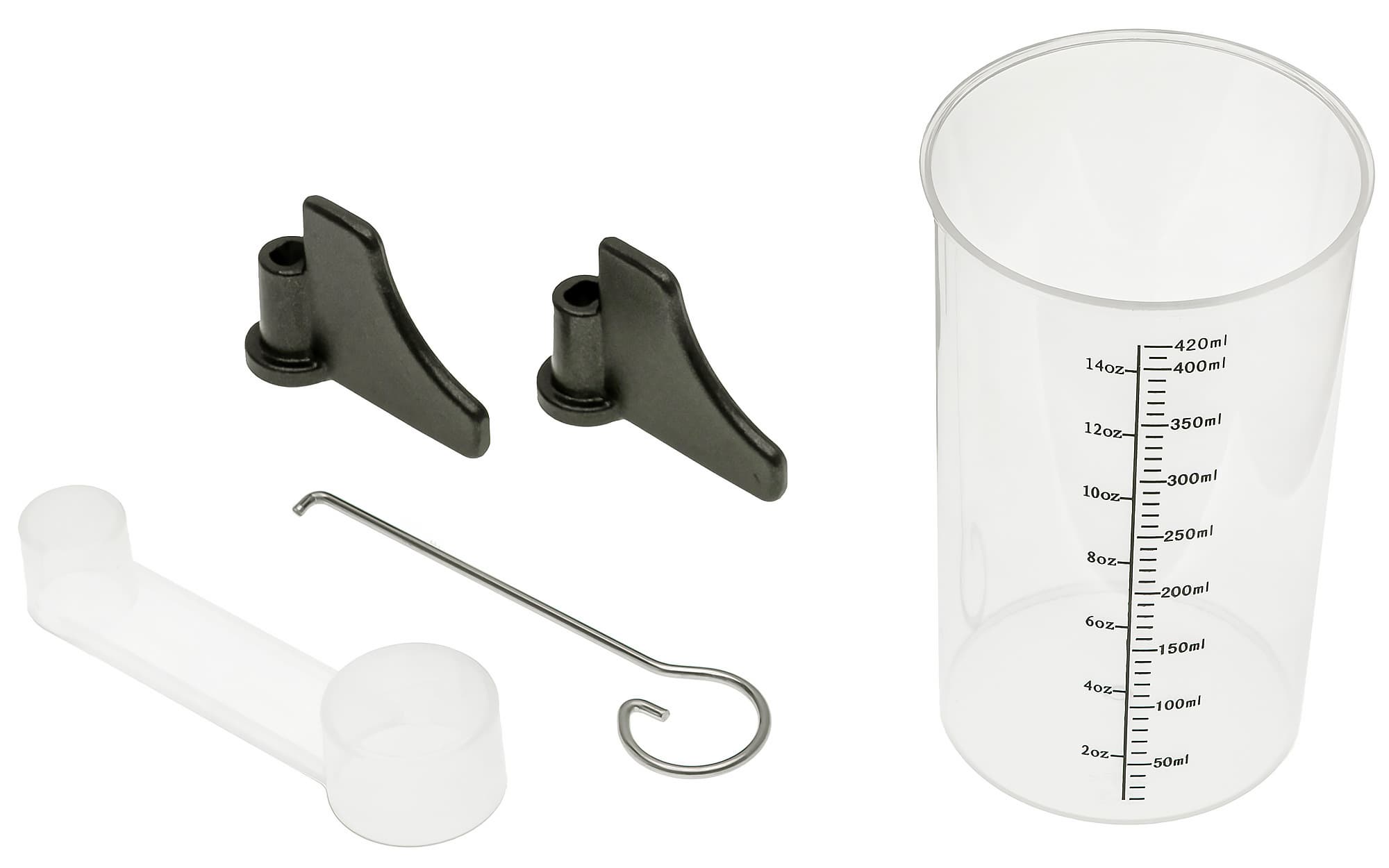 В комплект к прибору входят: крючок для извлечения лопастей из хлеба, мерный стакан и ложечка, совмещающая в себе меру столовой и чайной ложек. Мерный стакан снабжен шкалой объема в мл и унциях — от 50 до 420 мл с шагом в 10 мл и от 2 до 14 унций с шагом в 2 унции.