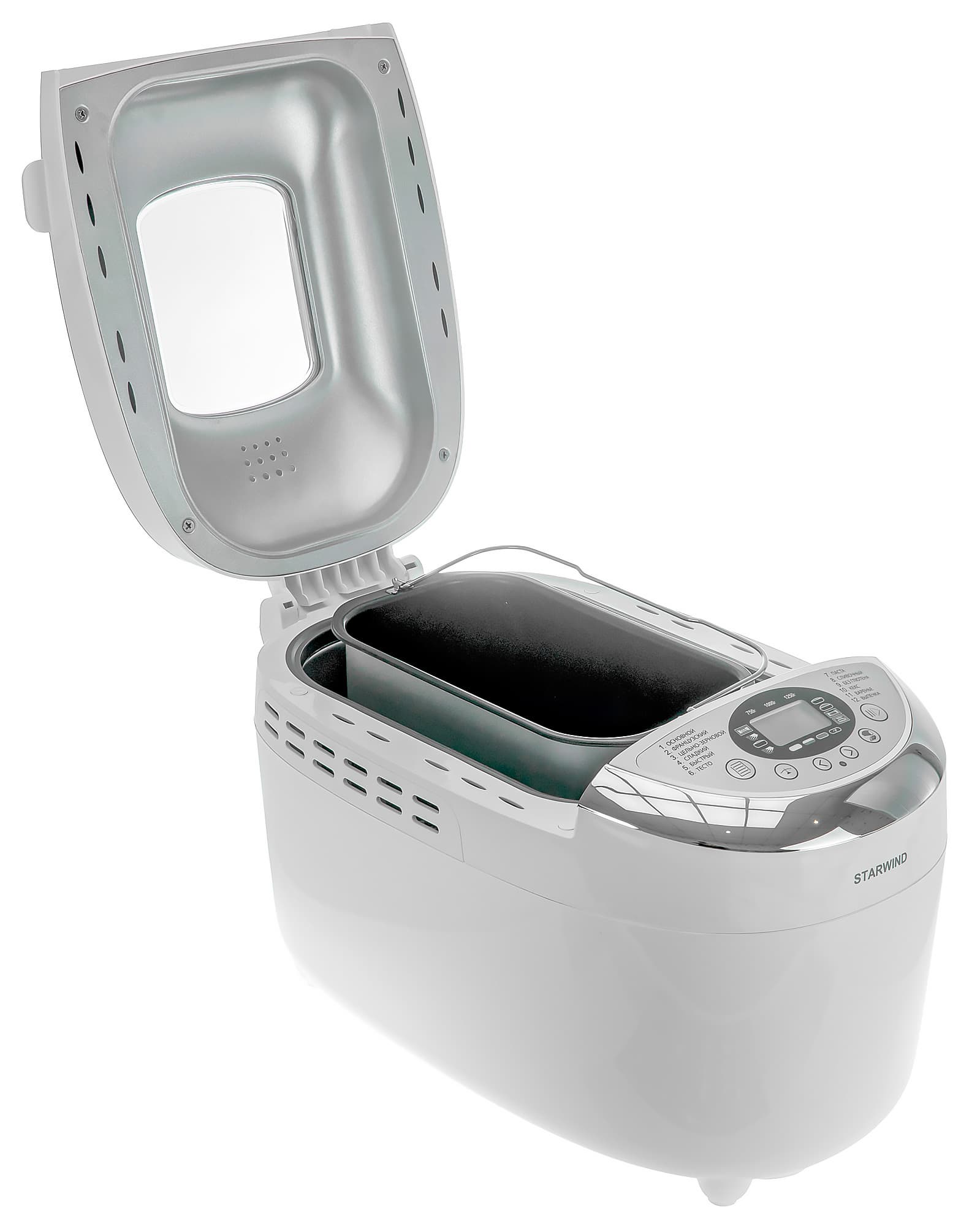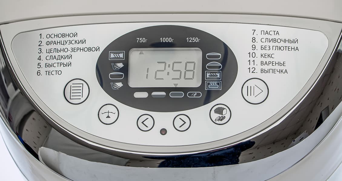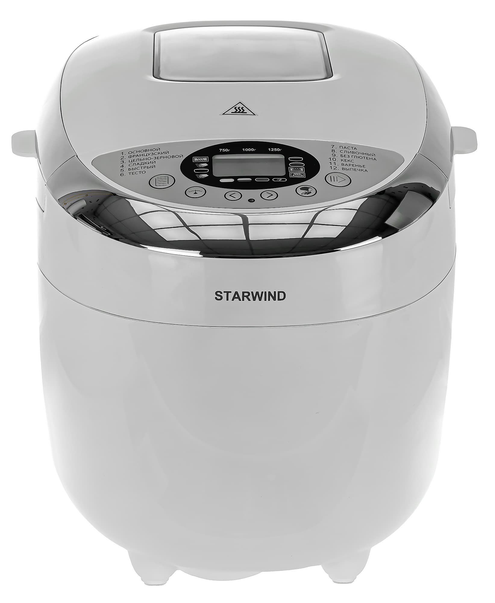 Хлебопечь Starwind SBMM1224 снабжена 12 программами: основная, французский хлеб, цельнозерновой, сладкий, быстрая выпечка, тесто, паста, сливочный, без глютена, кекс, варенье, выпечка. Как видно, список программ охватывает основные задачи, для которых предназначен прибор. Список программ вынесен на панель управления — это чрезвычайно удобно. Помимо программы пользователь может задать желаемый вес хлеба, цвет корочки, таймер отсрочки или ускоренное время программы.