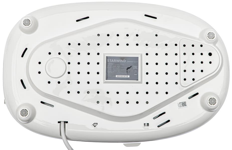 Вверху боковых сторон и сзади расположены вентиляционные отверстия, отводящие горячий воздух во время процесса выпечки. Шнур выходит справа ближе к задней стенке корпуса. Длина его, как и у всех приборов такого типа не чрезмерна, но достаточна для комфортной эксплуатации. Отсека для хранения шнура конструкцией не предусмотрено.