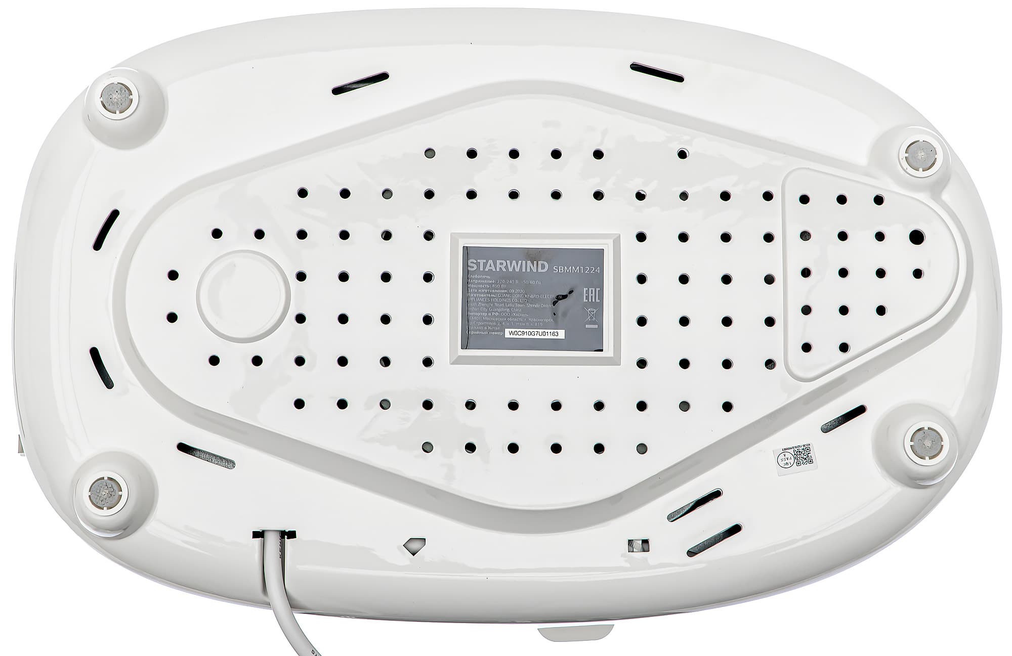 Со стороны дна мы видим множество вентиляционных отверстий, наклейку с информацией о приборе и четыре ножки, снабженные предотвращающими скольжение накладками. Высота ножек — около 2 см.