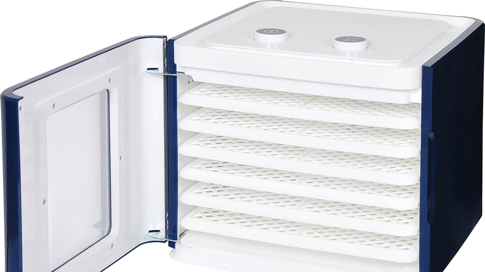 Верхняя часть дегидратора полностью белая. На ней выделяются органы управления — кнопка включения и ручка регулировки температуры.