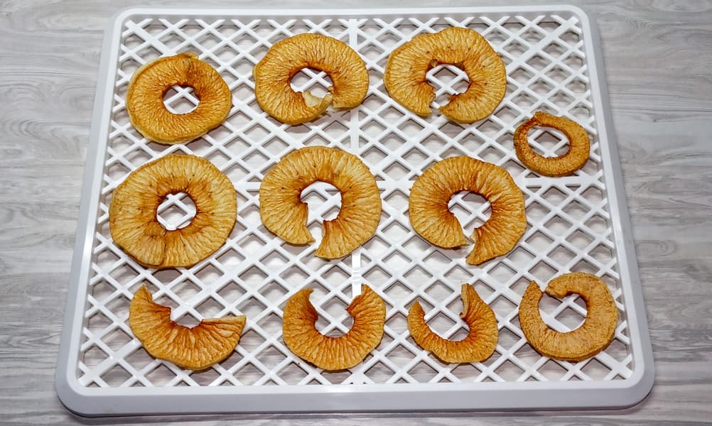 Примерно за 6,5 часов наши яблоки высохли ровно до нужной нам консистенции: сухие, но довольно мягкие, не пересушенные.