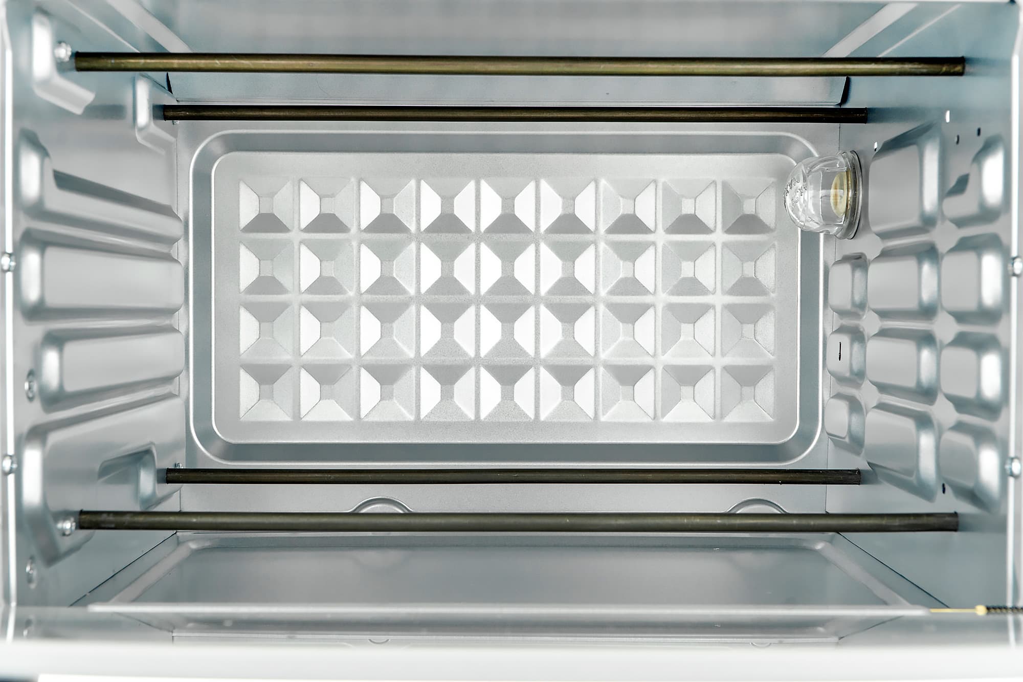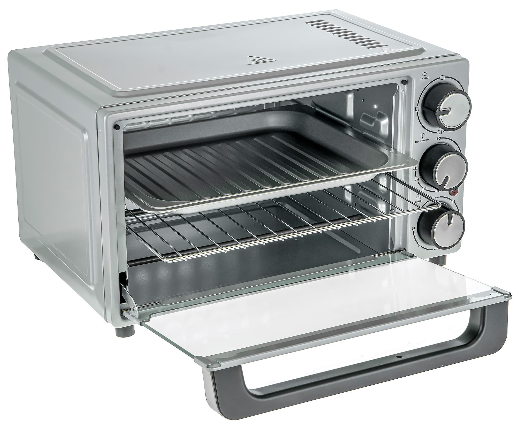 Ростер совсем небольшой, легкий и устойчивый. Корпус металлический, дверца из жаропрочного стекла. Никаких наклеек, рекламных слоганов и прочих украшательств — только небольшой логотип производителя снизу дверцы. Ручка для открывания большая, удобная, фиксирует дверцу в трех положениях: закрыто, открыто, полуоткрыто. Справа от дверцы большие поворотные переключатели: таймер, переключатель температуры и переключатель режима работы. Рядом с ними красный индикатор включенного состояния.