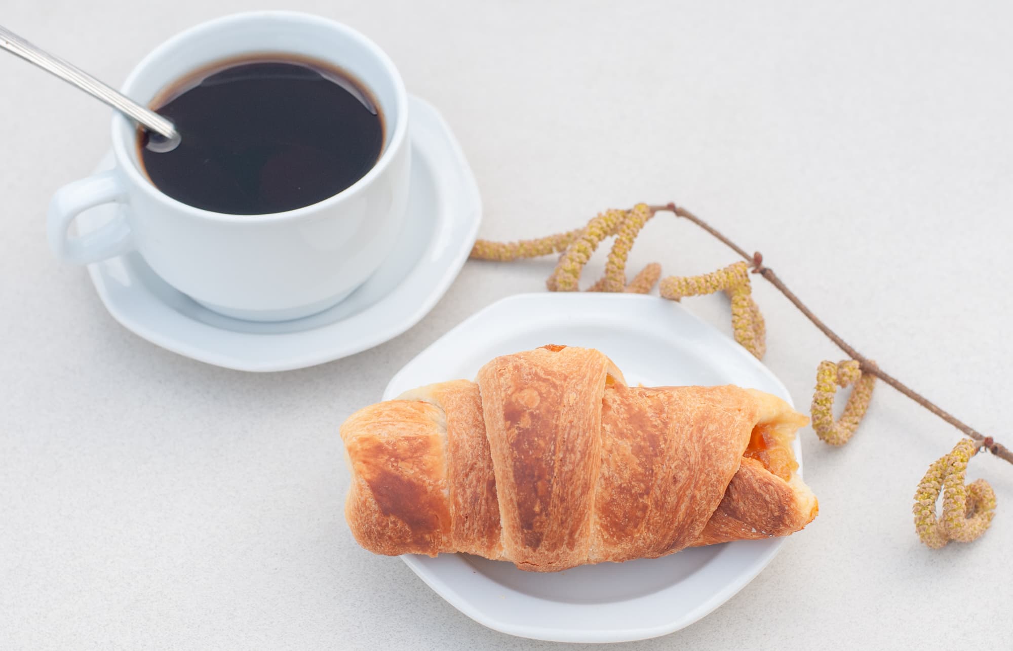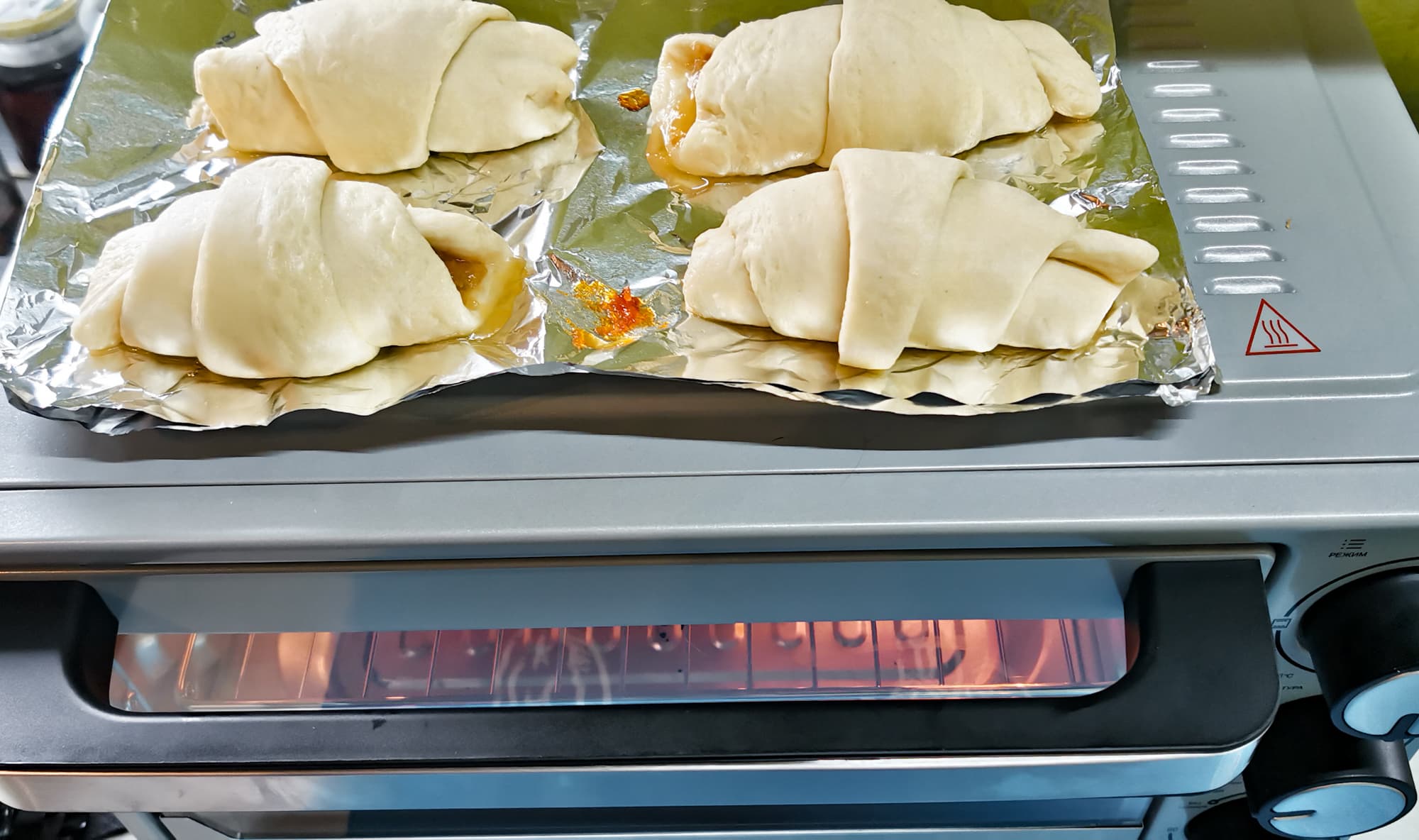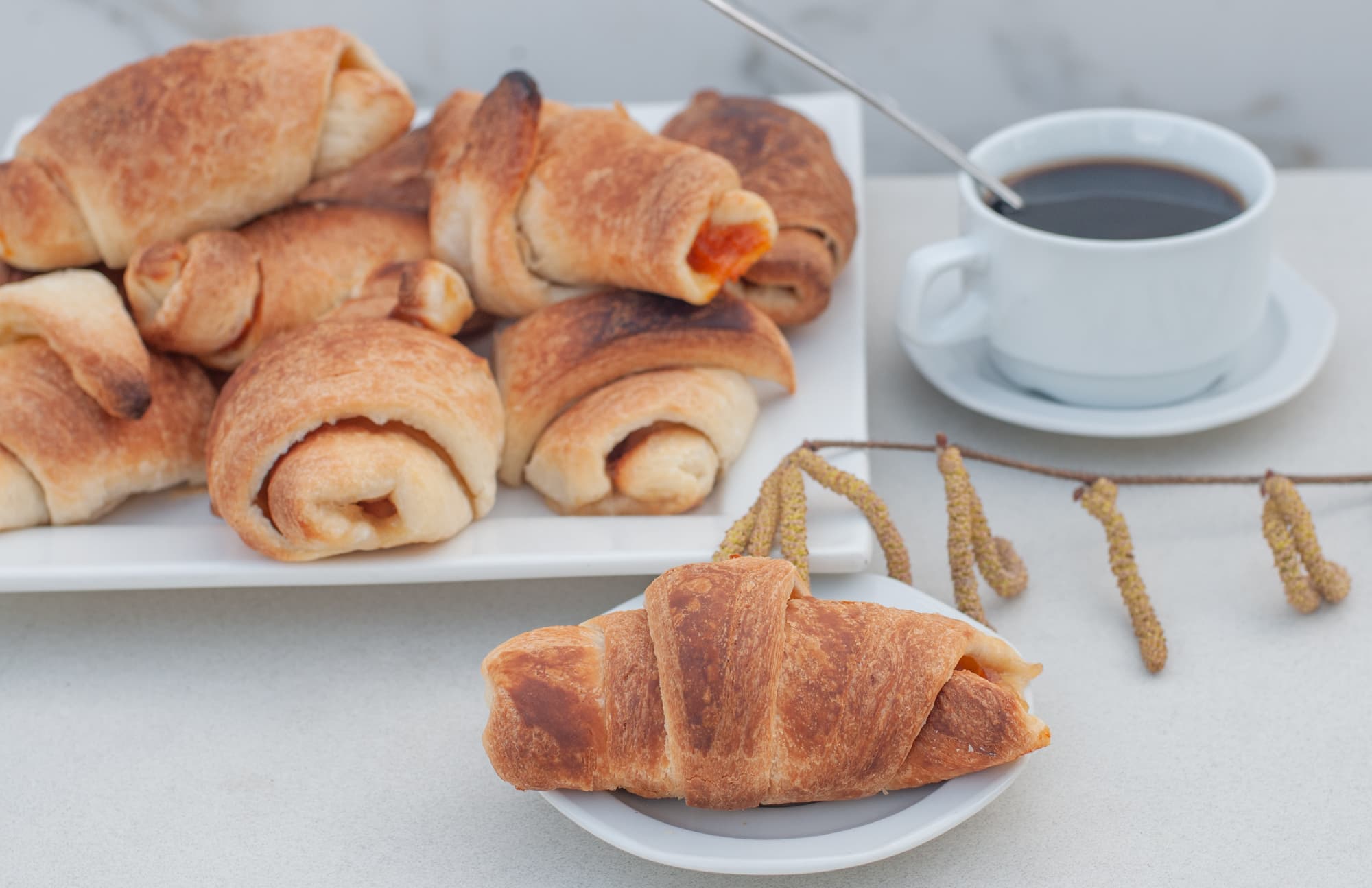 Для круассанов с джемом нам понадобился абрикосовый джем и слоеное тесто. Тесто разморозили, нарезали треугольниками, раскатали, положили внутрь джем. Пока готовилась одна партия круассанов, следующую ставили на расстойку на верх печки — там тепло и дрожжевое тесто хорошо поднималось.