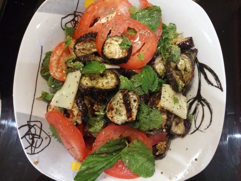 Следующую партию мы выложили в два слоя и уже через 3 минуты кусочки стали полосатыми, однако в целом баклажаны оставались больше сырыми, чем жареными, и снова пришлось дать им время приготовиться. Чтобы вернуть сочность нашим кусочкам, мы приготовили салат с баклажанами, где дополнили их оливковым маслом, соевым соусом и специями, а также помидорами, свежей мятой и сыром. При более толстой нарезке (от 1 см) проблем с жаркой баклажанов возникнуть не должно.