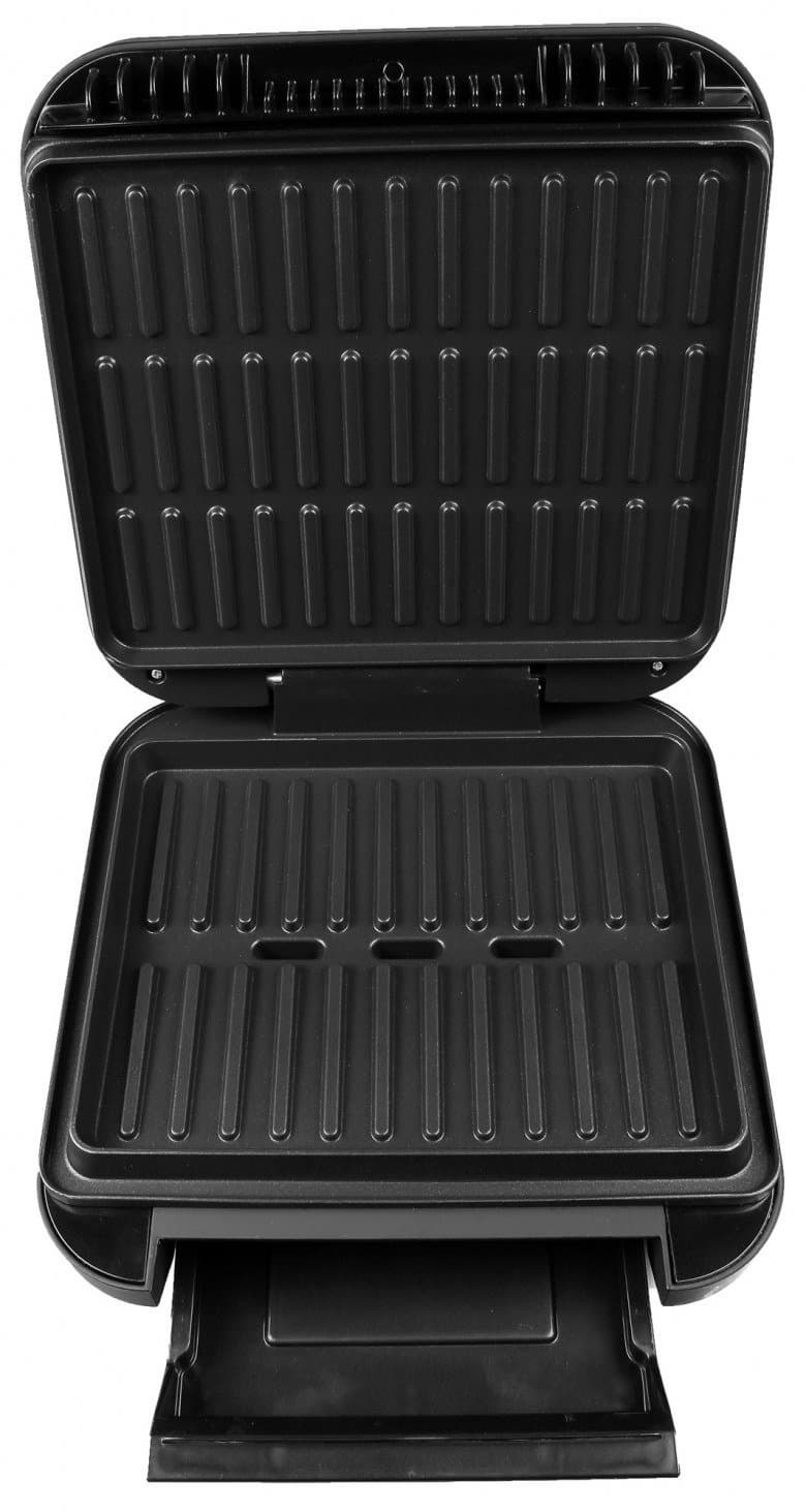 Поддон для сбора стекающего жира удобно спрятан внутри прибора и не допускает попадания брызг на кухонные поверхности. Три отверстия нижней панели достаточно хорошо освобождают ее от излишков сока. Поддон глубокий и переполнить его не представляется возможным, тем более, что производитель рекомендует очищать его после каждого использования гриля.