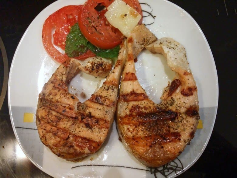 Стейки крупной форели мы посыпали специями и выложили на гриль по 4 порции за раз. Куски толщиной 10-12 мм успевали приготовиться всего за 10 минут, а стейки на 15-20 мм требовали уже 15-20 минут, но результат того стоил. Нежная, сочная, ароматная рыба успевала приобрести еще и слегка похрустывающую корочку шкурки.