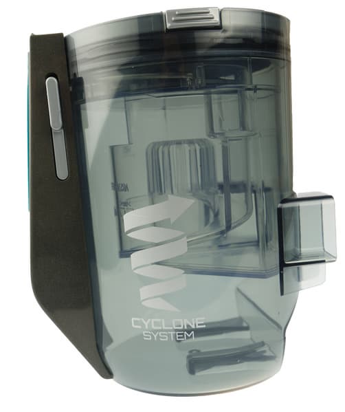 Втянутый пылесосом поток воздуха попадает в циклонный фильтр мусоросборника, где закручивается против часовой стрелки, поднимаясь вверх. Крупный и тяжелый мусор при этом выбрасывается центробежной силой через отверстия в верхней части циклона и оседает в контейнере. Мелкая пыль проходит через центральные отверстия и поступает на фильтр тонкой очистки.