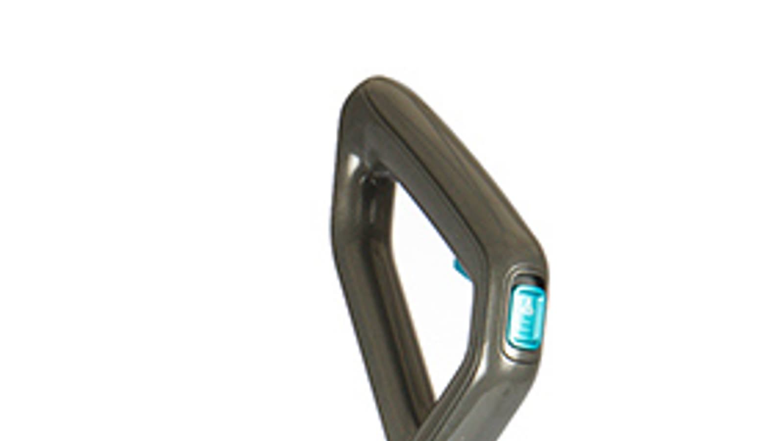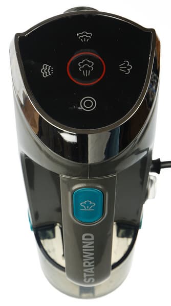 Корпус у Starwind SSV9550 серо-стальной с бирюзовыми декоративными элементами. Его конструкция традиционна для вертикальных паровых пылесосов: удлинительная ручка с дублирующими элементами управления, съемный блок парогенератора, моторный блок пылесоса с мусоросборником и единственная насадка для влажной и сухой уборки пола, заодно служащая устройству опорой.