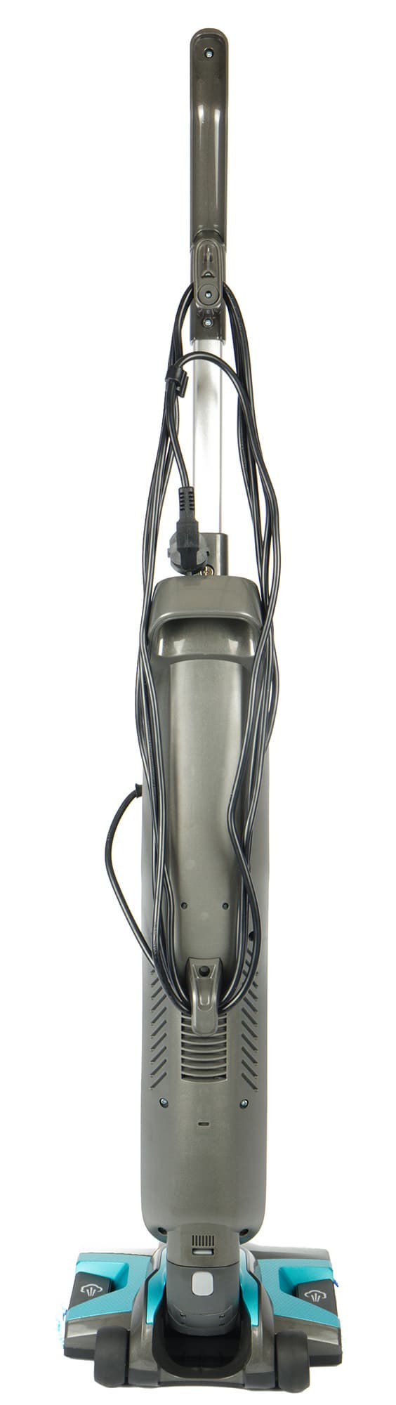 Эта модель не стала исключением в ряду подобных ей: носить ее из комнаты в комнату довольно тяжело. А вот работать ей вполне удобно: этому способствуют хорошо продуманный баланс и легкость вращения роликов половой щетки (на них пылесос опирается).