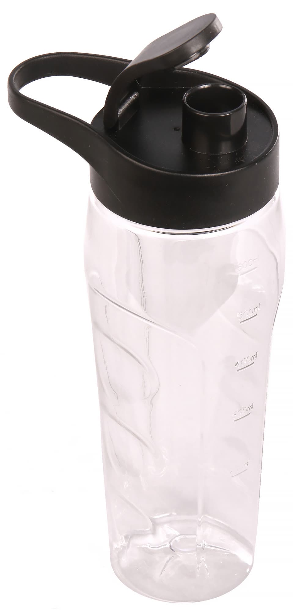 Прозрачная бутылка из тритана также снабжена метками объема до 600 мл и может соединяться с насадкой с ножами, чтобы приготовить и взять с собой, например, смузи. Герметичная крышка с отверстием для питья навинчивается на бутылку, клапан в отверстии можно зафиксировать в открытом положении, а при желании можно повесить бутылку, используя пластиковую петлю на крышке. Форма бутылки могла бы модно называться «эргономичной»: на ней есть углубления как чисто эстетического характера, так и для более удобного захвата ладонью.
