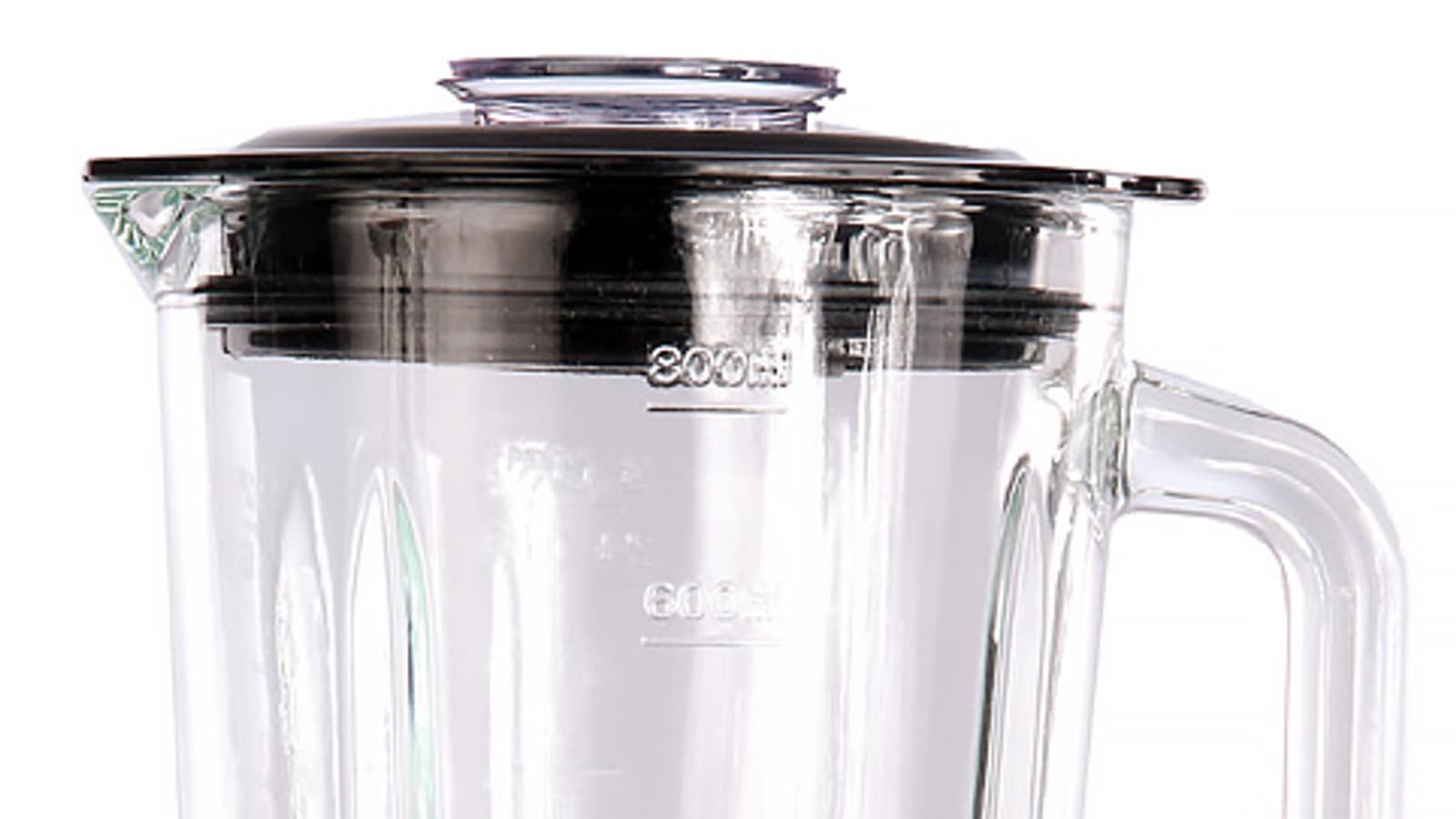 Сверху емкость плотно закрывается крышкой из глянцевого черного пластика с тонкой резиновой прокладкой по ободку. В середине крышки есть отверстие, чтобы добавлять продукты в процессе работы блендера, которое закрывается пластиковой «пробкой».