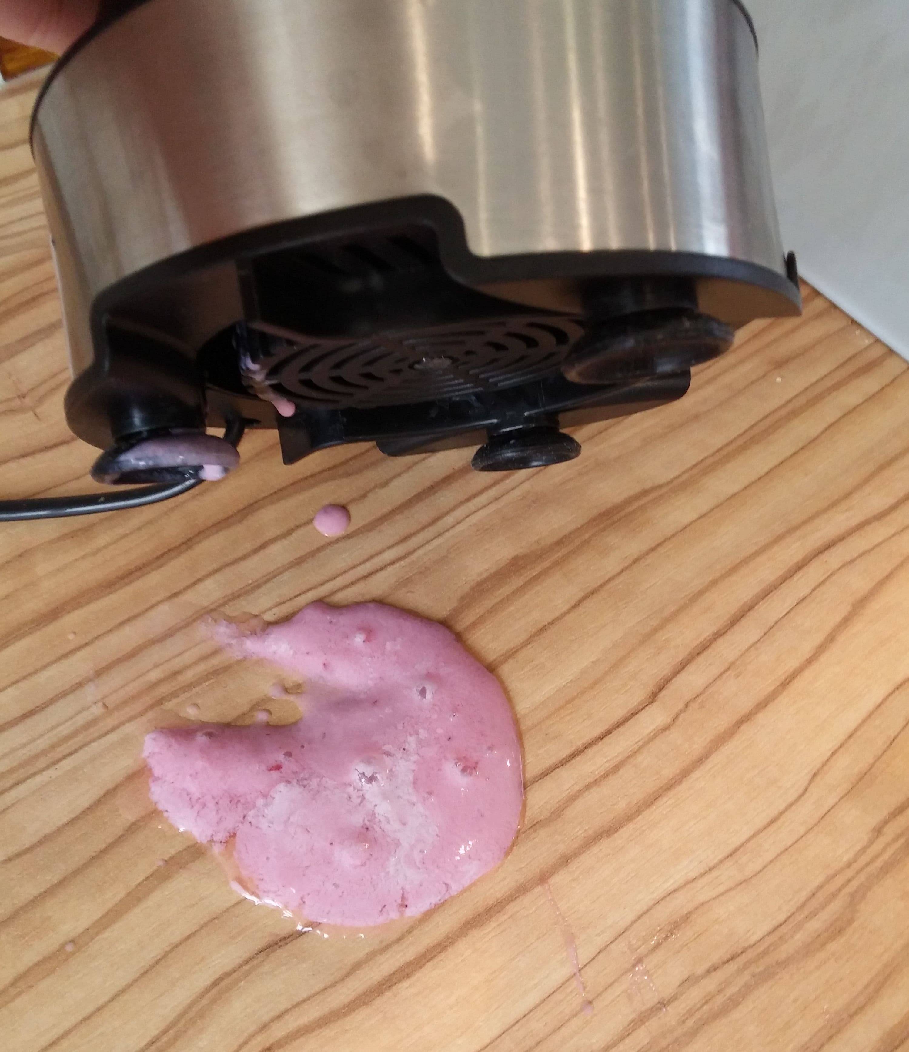 Мы включили блендер на 1 скорость на 10 секунд, затем перешли на 2 скорость на дополнительные 20 секунд и получили промежуточный результат: кусочки кожицы ягод явно присутствовали в напитке. Однако мы уже заметили протекание смузи внутрь прибора, поэтому обесточили его и остановили тест.