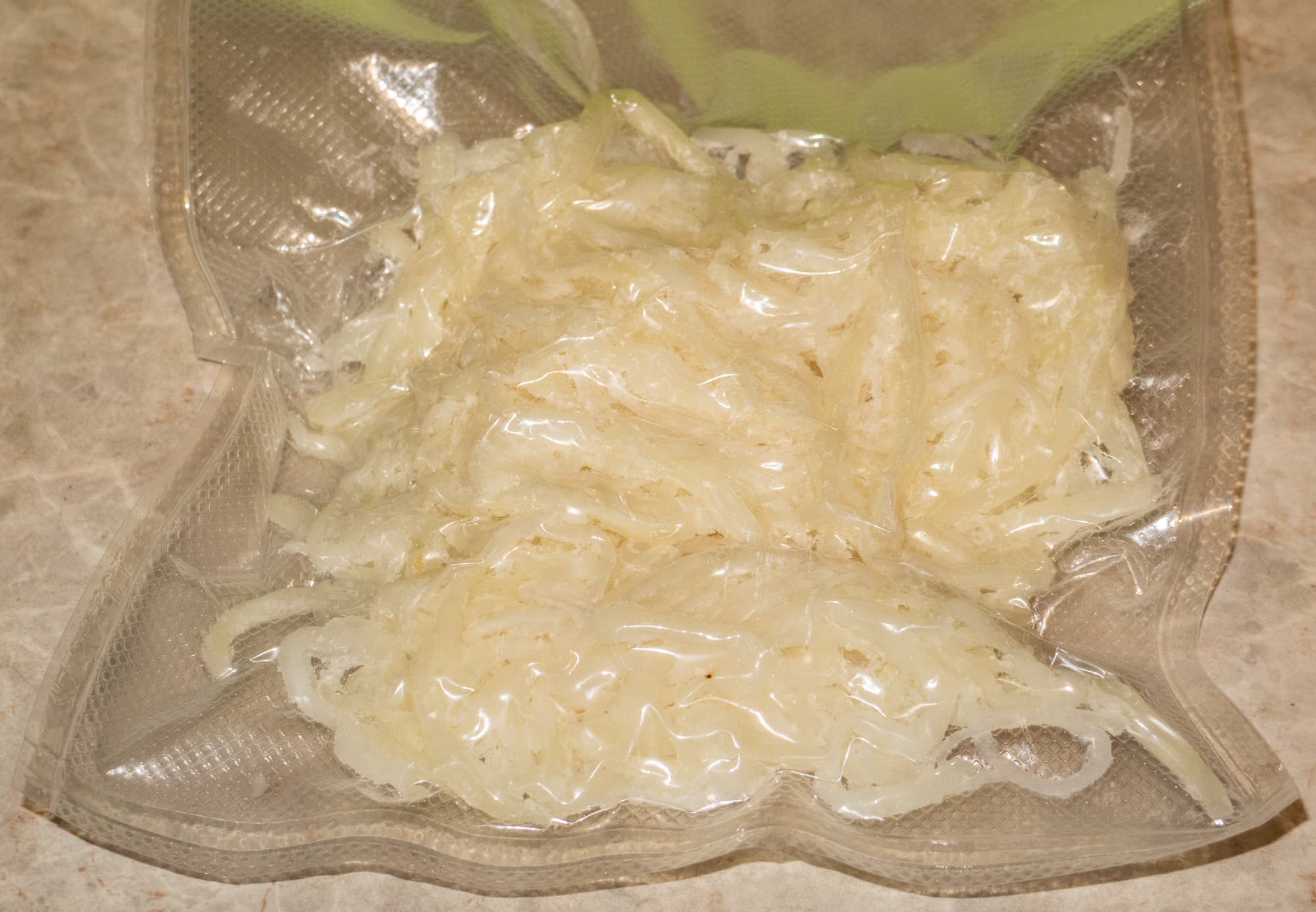 Хранение большого количества сушеных морепродуктов или рыбы всегда представляет определенные трудности: в сухом месте продукты пересыхают, во влажной среде — могут испортиться. По случаю у нас в руках оказалось полтора килограмма сушеного кальмара, а съесть его за неделю довольно трудно. Вакуумный упаковщик в таких ситуациях просто незаменим: можно расфасовать продукт в небольших порционных пакетах и вскрывать их по мере надобности. Срок хранения завакуумированных сушеных продуктов довольно долог, а главное, что продукт не теряет своего качества.