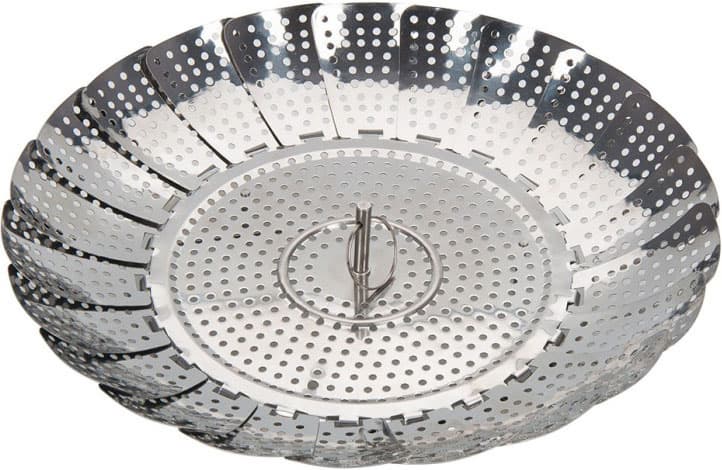 Основные достоинства такого устройства — простота в очистке (металл проще отмыть, чем бамбук), компактность (пароварка легко складывается и раскрывается — прямо как цветок), а также «совместимость» с кастрюлями самого разного диаметра. Металлическую пароварку можно использовать с большинством 2—5-литровых кастрюль и сотейников.