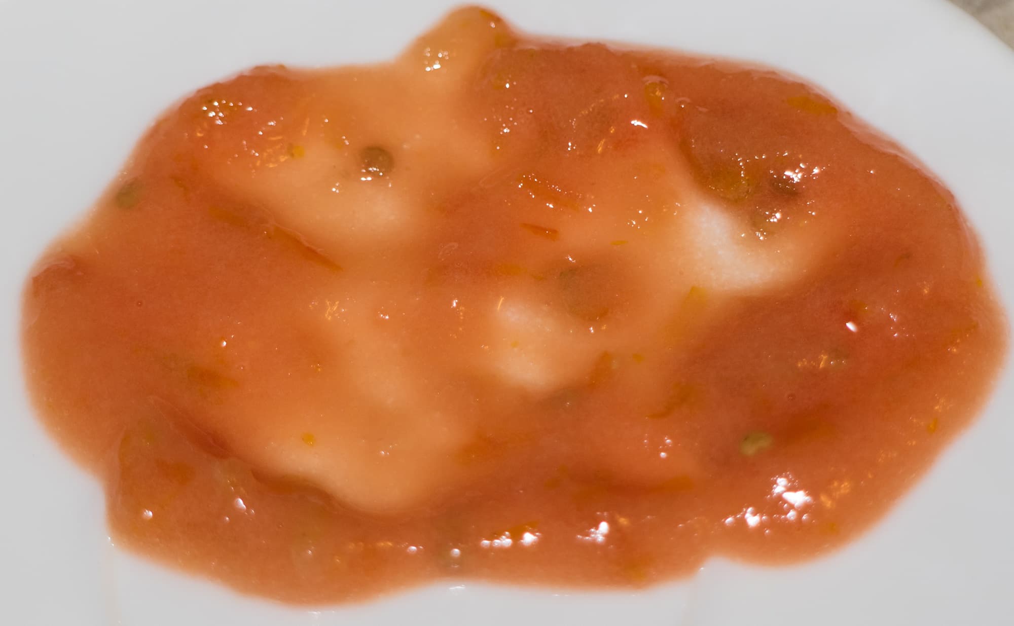 Для проведения этого обязательного теста мы взяли томаты общим весом 400 граммов. Блендировали насадкой для измельчения в течение полутора минут. Результат стандартный для погружных блендеров: иногда встречаются остатки зёрен и мелких неперемолотых кусков шкурки, но в целом масса гомогенная.