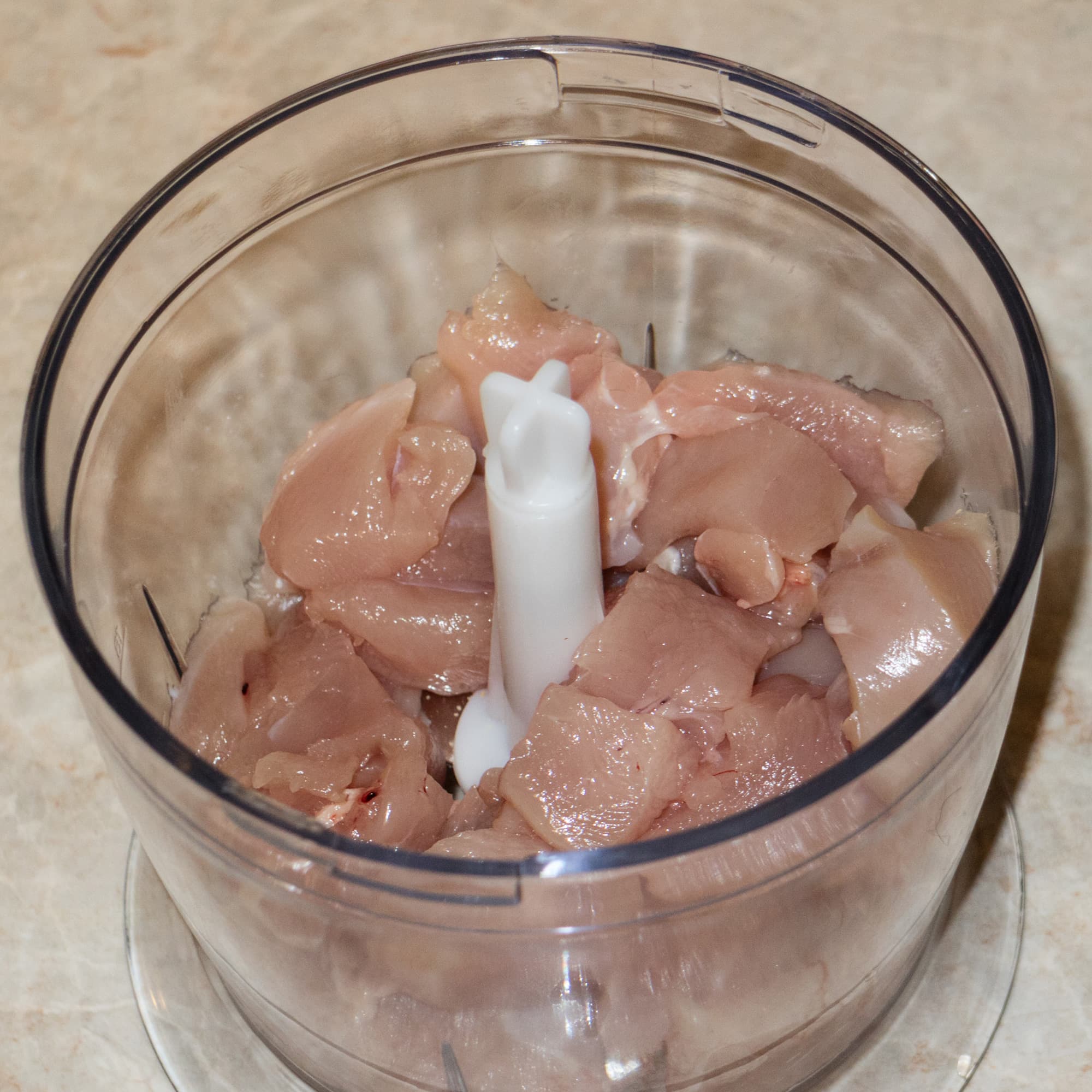 Для этого теста мы взяли филе грудки курицы, нарезанное на примерно равные кусочки. В чашу измельчителя поместилось 350 граммов продукта.