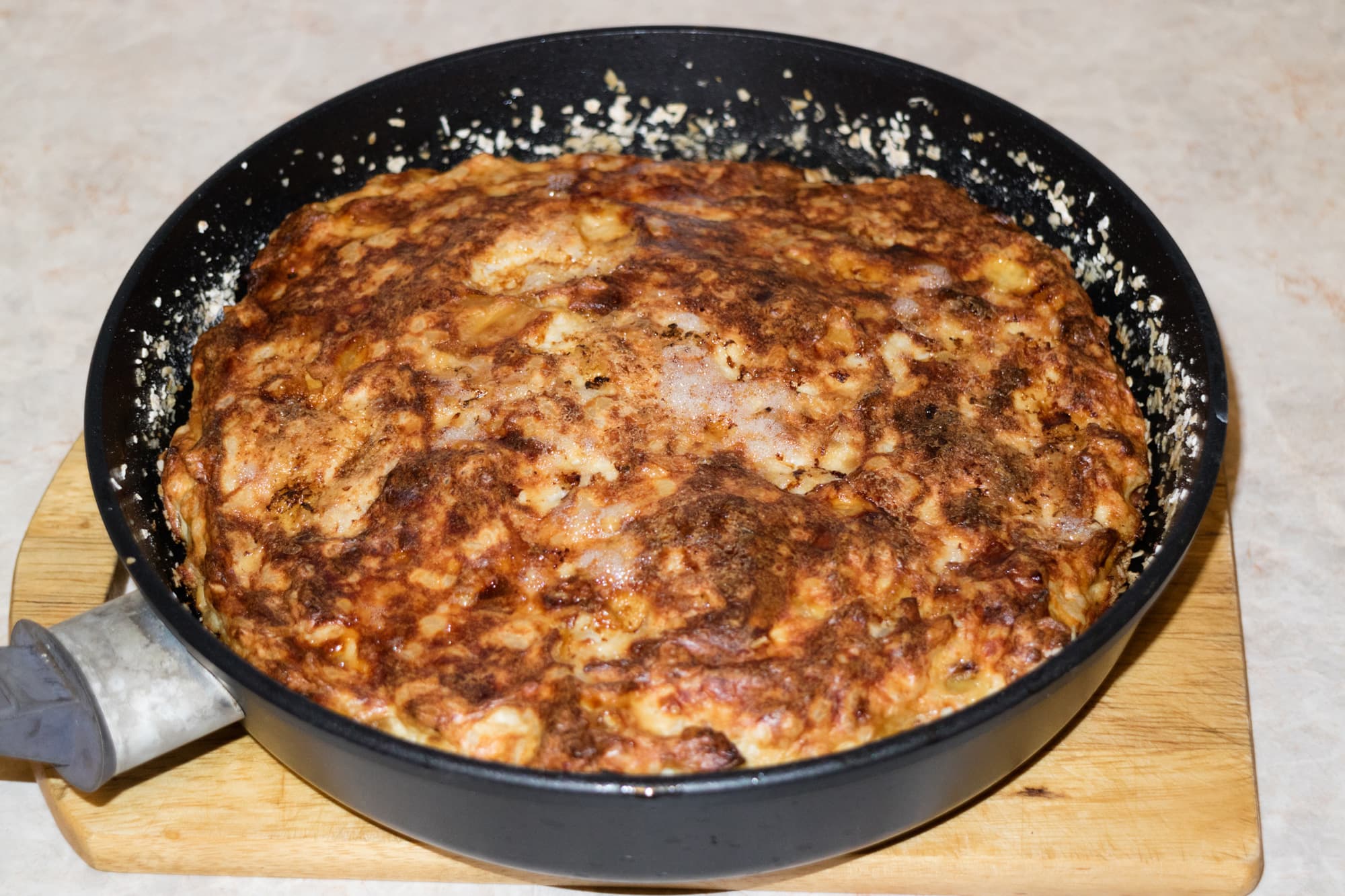 Взбитые белки были аккуратно вмешаны в фарш. После этого выложили массу на сковороду, смазанную сливочным маслом и посыпанную толчеными овсяными хлопьями. Разровняли поверхность, поместили наверху несколько кусочков сливочного масла. Запекали 15 минут на 230 °C, затем, уменьшив температуру до 180 °C, еще 25 минут.