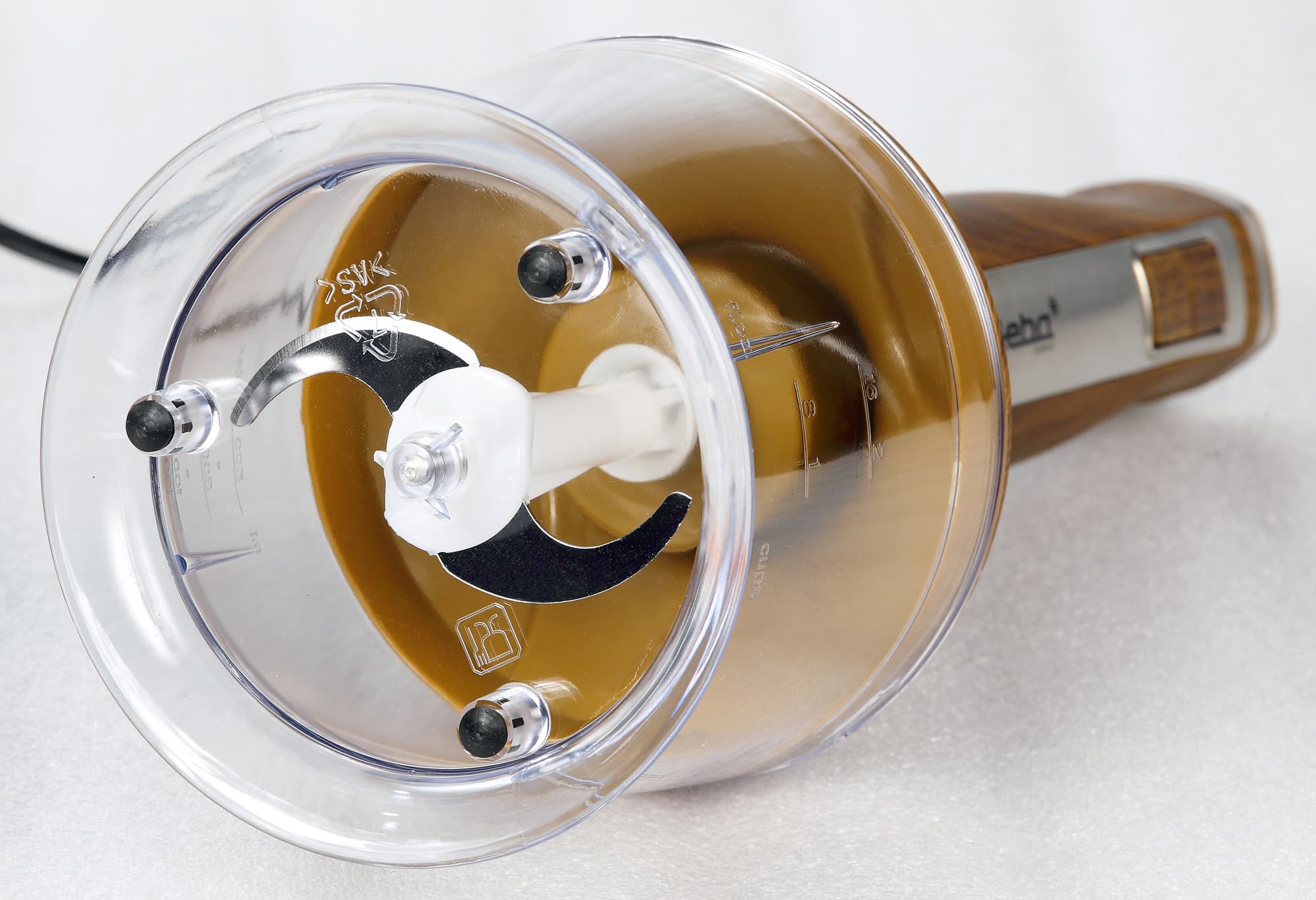Моторный блок, он же ручка с электромотором, выполнен из металла и пластика. Пластик окрашен «под дерево». Внешний вид блендера, впрочем, как и всех изделий от Steba, довольно благороден в своей простоте и невычурности. Не сказать, что ручка очень легкая, но благодаря своей эргономичной форме она удобно размещается в ладони, пальцы свободно дотягиваются до кнопок управления. На ощупь пластик не скользит, никаких запахов не издает. Сверху на моторном блоке выделен LED-дисплей с двумя, расположенными над ним, кнопками увеличения и уменьшения скорости вращения ножей. Насадки надеваются на моторный блок просто: необходимо вставить насадку и повернуть ее по часовой стрелке до упора.