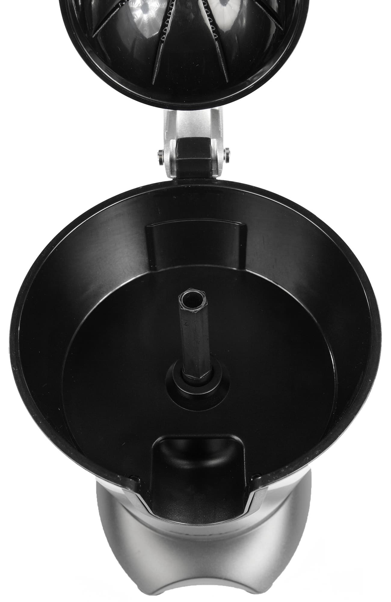 Как мы уже писали выше, все сводится к тому, чтобы засунуть половинку цитруса в специальную чашу и потом с помощью рычага надавить ею на конус. Конус начнет вращаться, выдавливая из цитруса сок. Если прекратить давить — конус приподнимется чуть-чуть вверх (миллиметра на 3-4) и остановится.