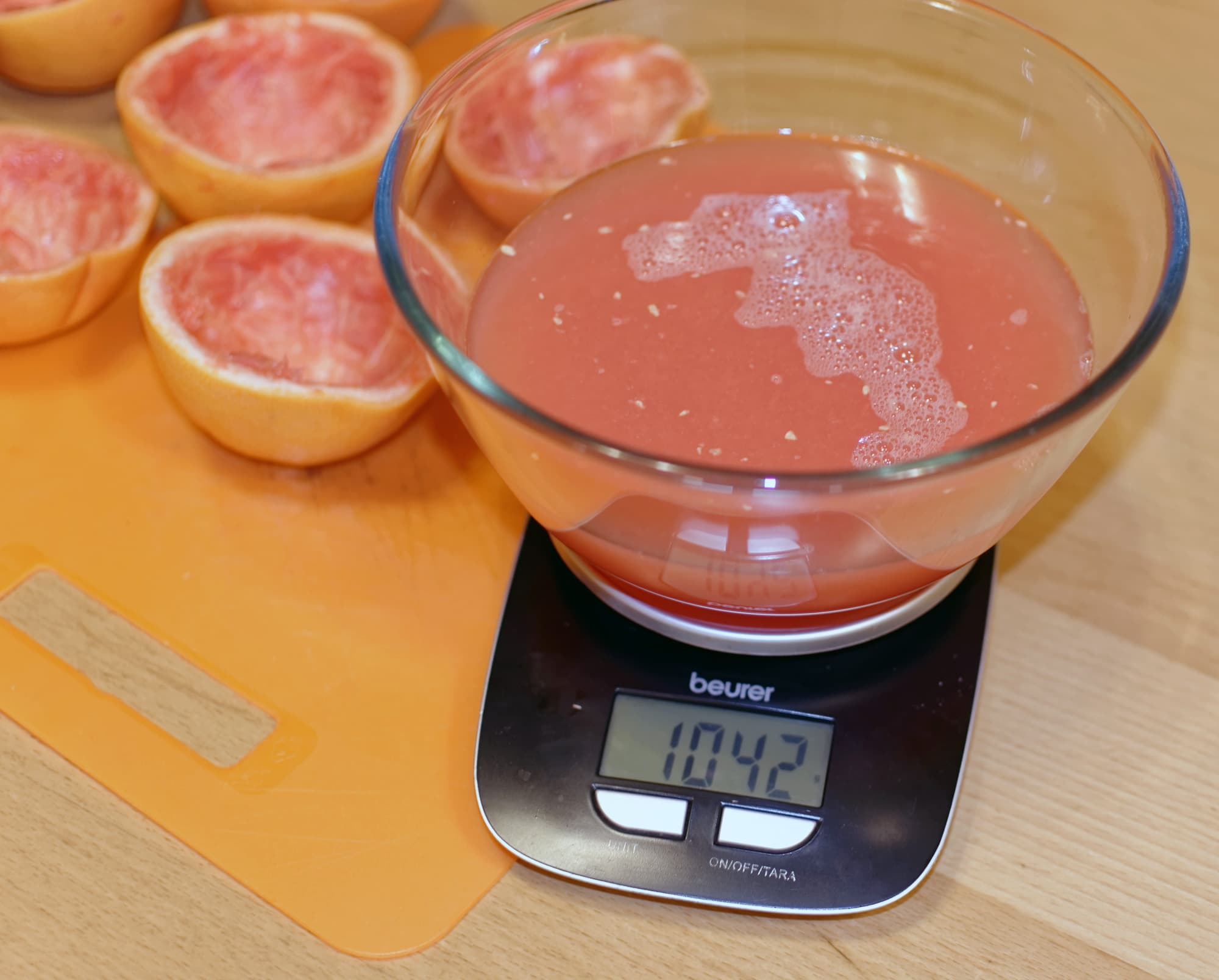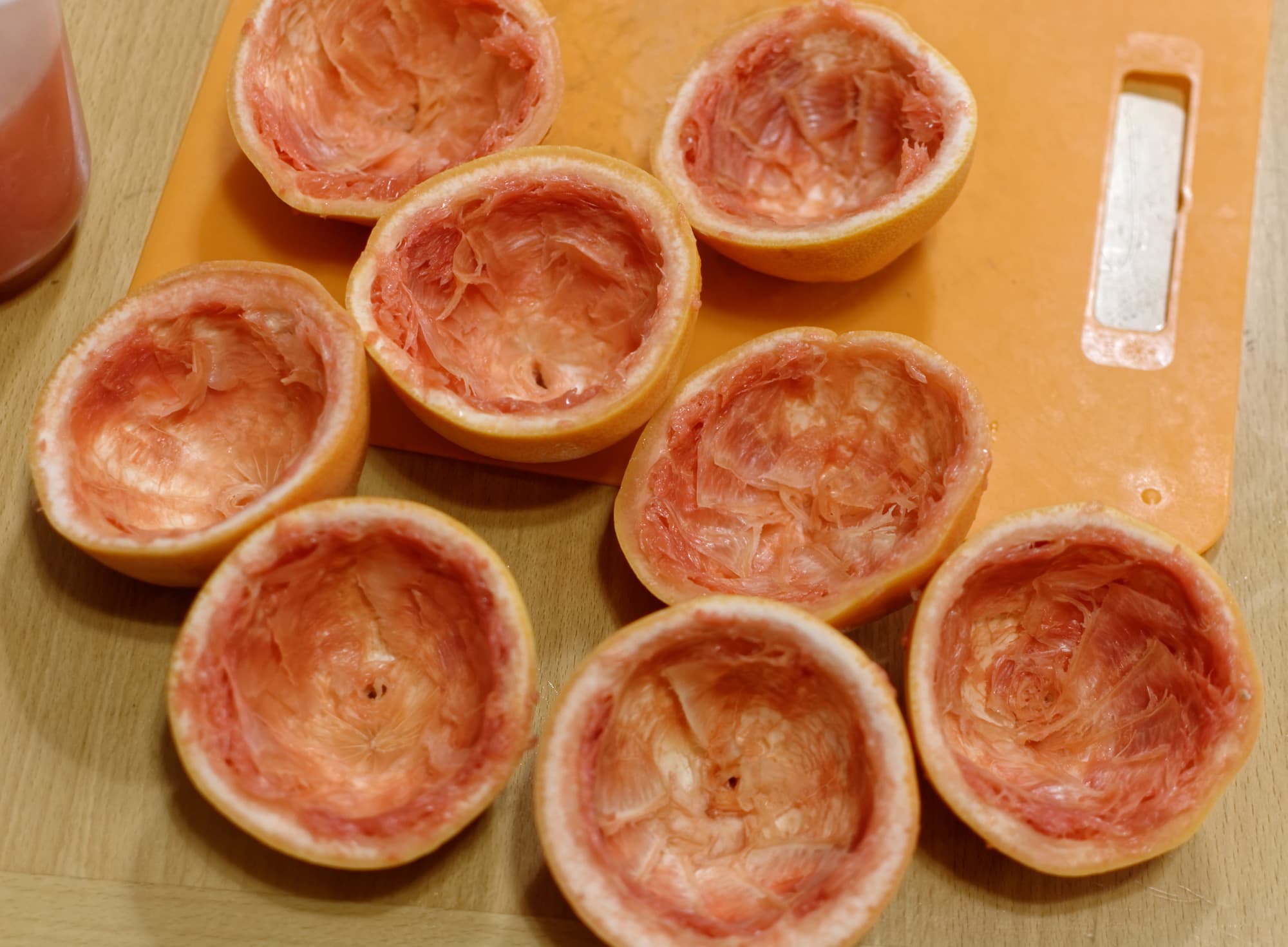 Получили в результате 270 граммов лимонного сока. Неожиданно высокая эффективность — 46%! Конечно, лимоны и сочнее, и кожура у них менее толстая, но все равно впечатляет.