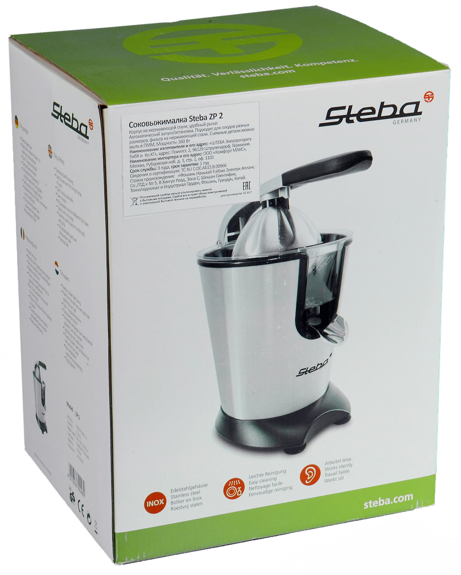 Steba ZP 2 — солидно выглядящая и солидно стоящая соковыжималка для цитрусовых, которая в процессе работы полностью оправдала свой внешний вид: работать с ней удобно, разбирается, моется и собирается она быстро. Продемонстрированные ею результаты, по всей видимости, находятся где-то близко к верхнему краю показателей, которые в принципе могут продемонстрировать устройства этого типа.