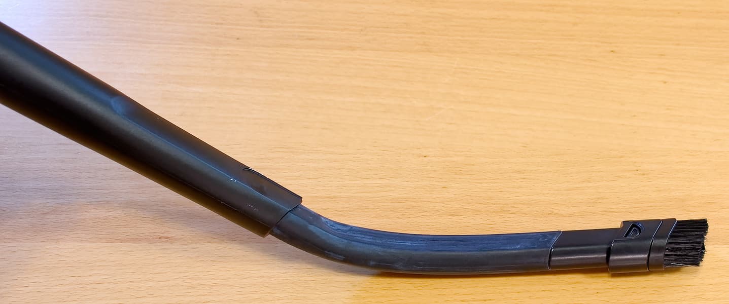 Электрощетка в самом высоком месте — порядка 75 мм, она оснащена шарниром, допускающим отклонение вверх по вертикали на 90°. Отклонение щетки от патрубка влево-вправо невелико, но, в принципе, достаточно.