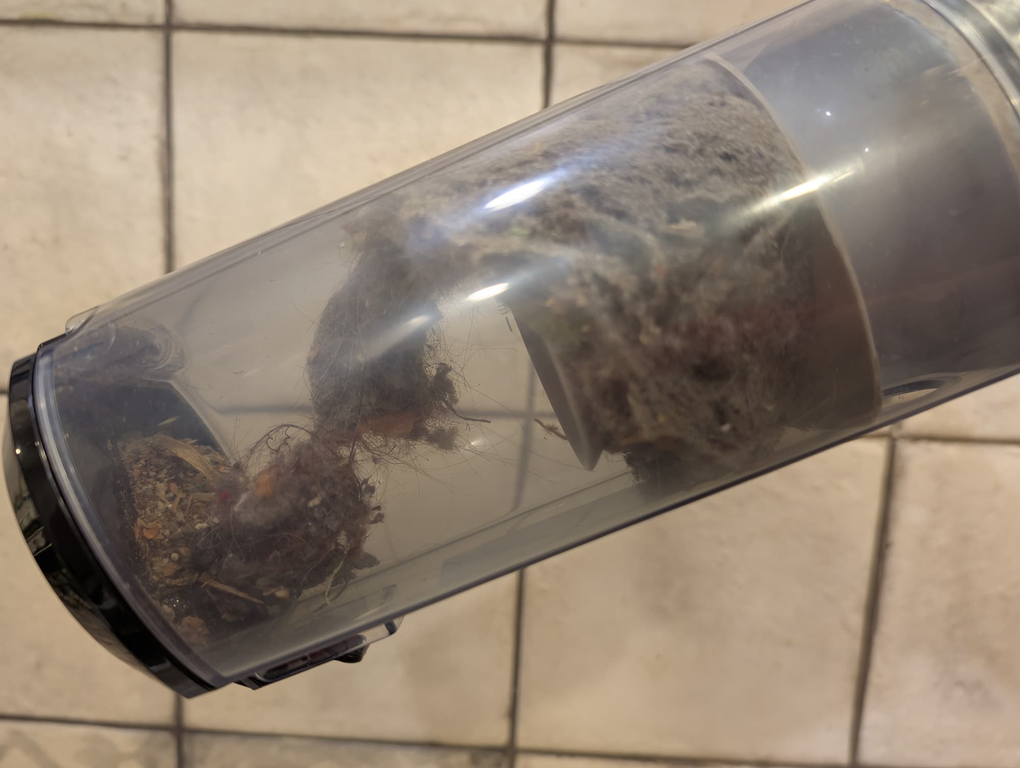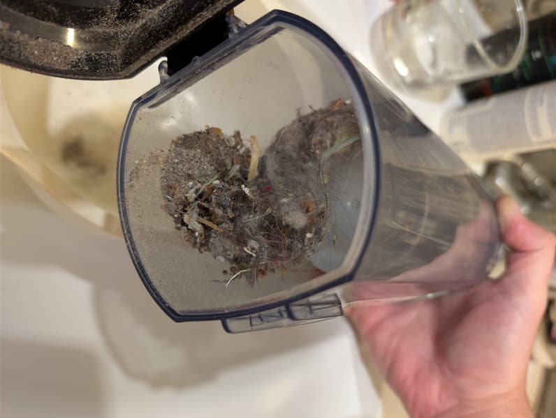 Не слишком высокая скорость воздушного потока заметно снижает эффективность циклонного фильтра: «недокрученный» в циклоне мусор собирается вокруг пластиковой сетки центрального элемента. В нижней части контейнера остаются только крупные и тяжелые фрагменты.