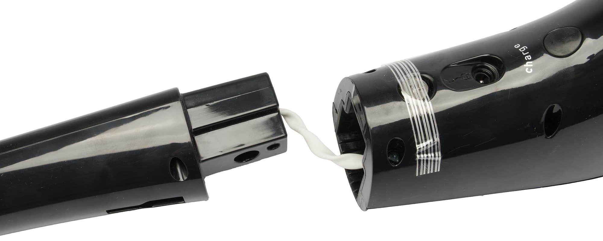 Перед началом работы ручку следует вставить в отверстие на корпусе и зафиксировать винтом, скрытым под полоской скотча. Рядом с отверстием мы видим разъем для подключения зарядного устройства.