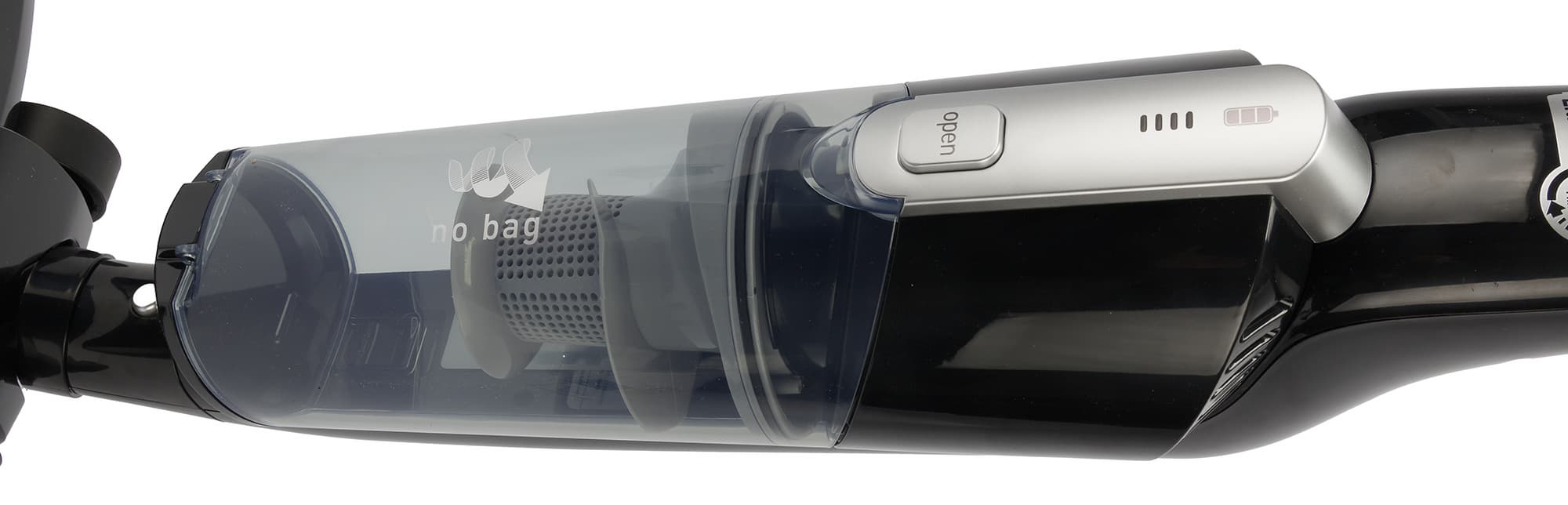 В средней части корпуса расположен прозрачный контейнер для мусора с циклонным и HEPA-фильтром.