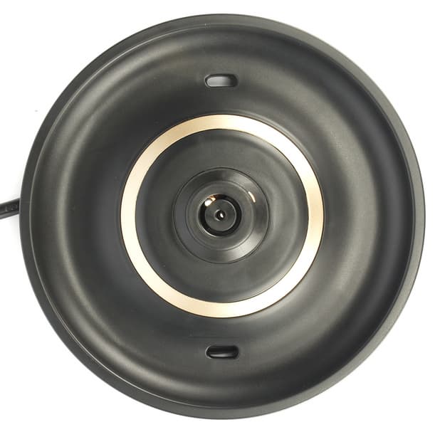 Осмотрев базу снизу, обнаруживаем место выхода шнура электропитания, отсек для его намотки и сам шнур. Производитель добавил две небольшие резиновые ножки, чтобы минимизировать скольжение базы по столу. Здесь также имеется шильдик с краткой технической информацией по прибору.