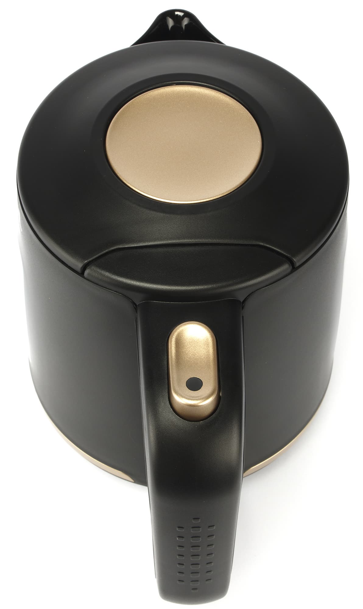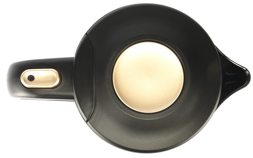 На крышке чайника расположена большая золотистая круглая кнопка открывания крышки.