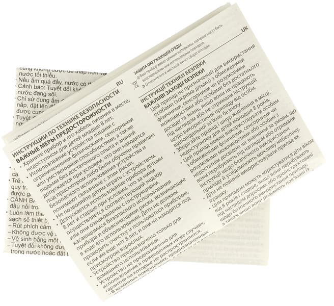 Недостатков у самого прибора мы не обнаружили, разве что наличие окошек у стандартного пластикового корпуса — такие вставки прямо в колбе могут стать местами протечек (а могут и не стать). Зато мы испытали сильную фрустрацию при взаимодействии с печатной документацией: в коробке мы обнаружили 4 разных брошюры из легко мнущейся бумаги, сложенные гармошкой, информация в которых представлена на множестве языков, с разным размером шрифтов (в том числе очень мелким) и весьма плохо структурирована. Чтобы найти необходимые сведения, нам пришлось почувствовать себя картографами, вооружиться лупой и терпением. На наш взгляд, это крайне неудачное решение.