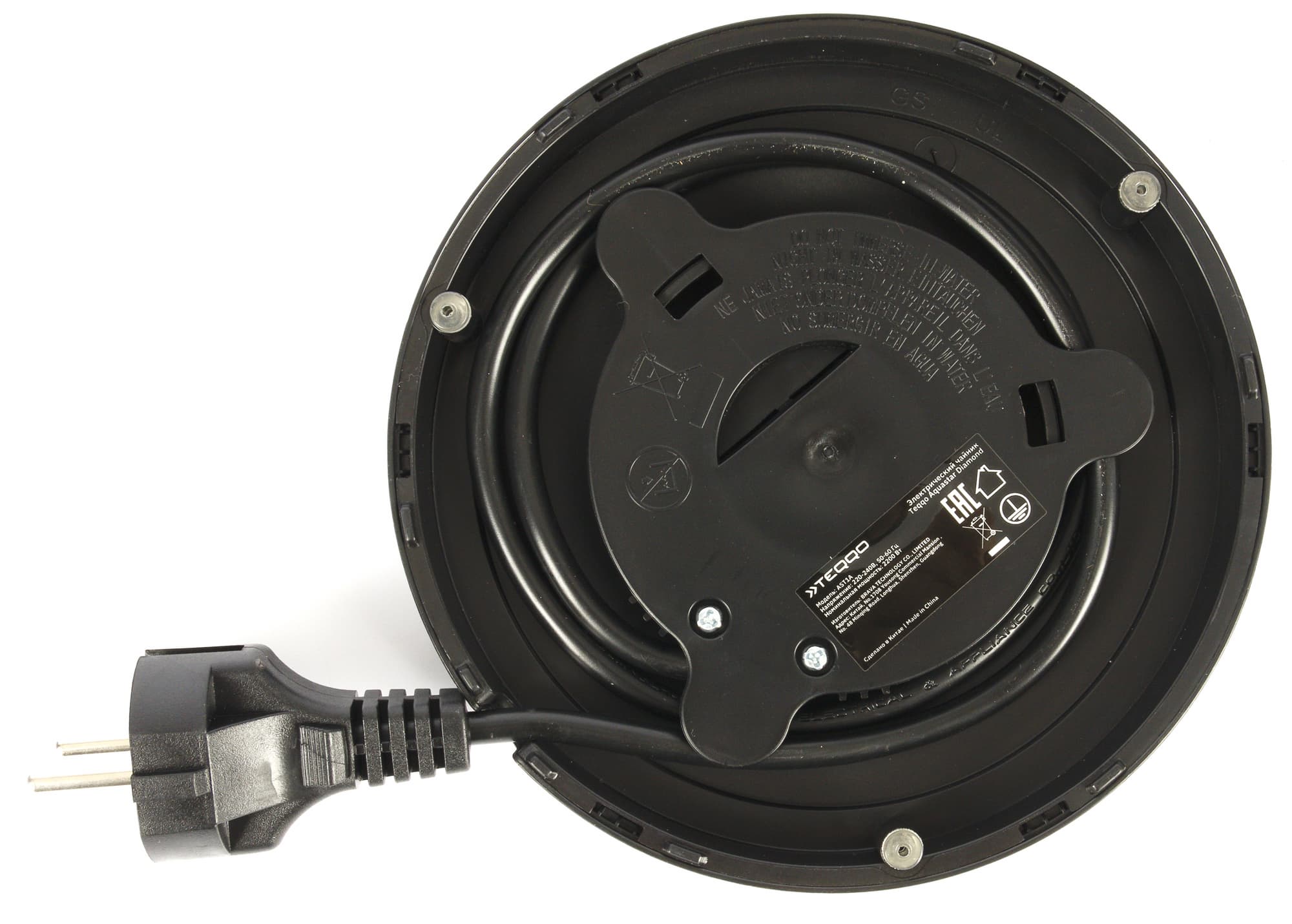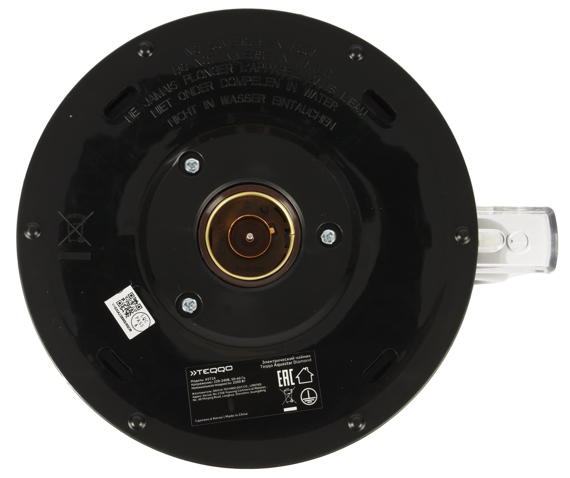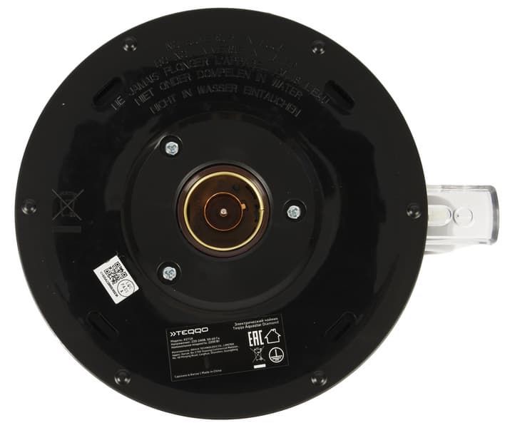 Круглая трехконтактная группа на дне чайника позволяет поворачивать прибор на базе на 360° и использовать в любом положении. Рядом с ней — две наклейки с названием производителя, серийным номером модели и краткими техническими характеристиками.