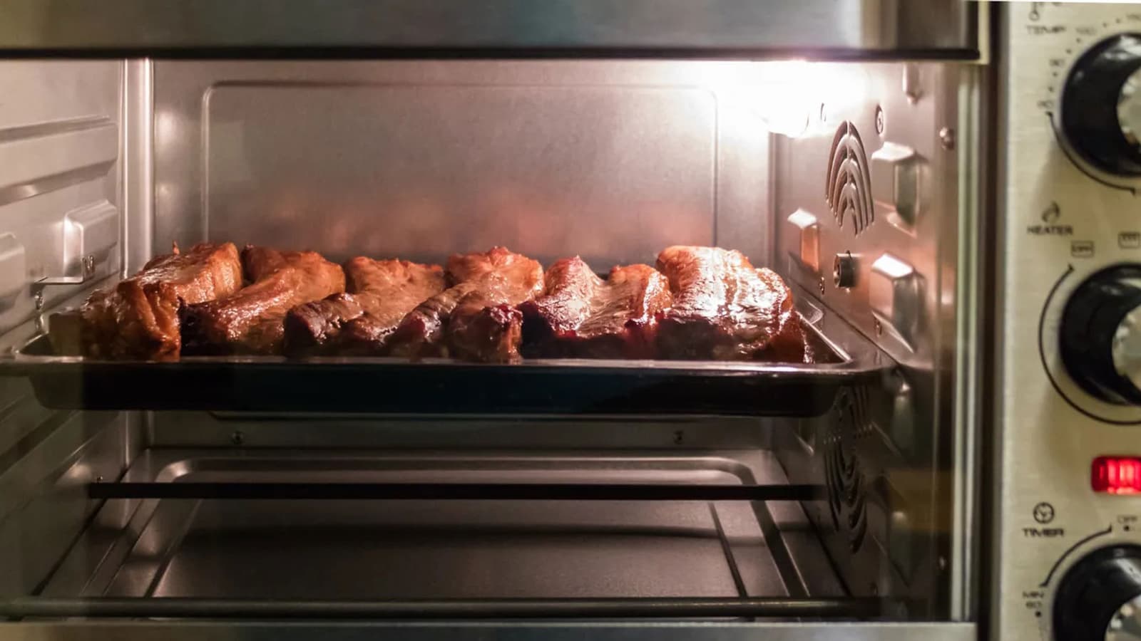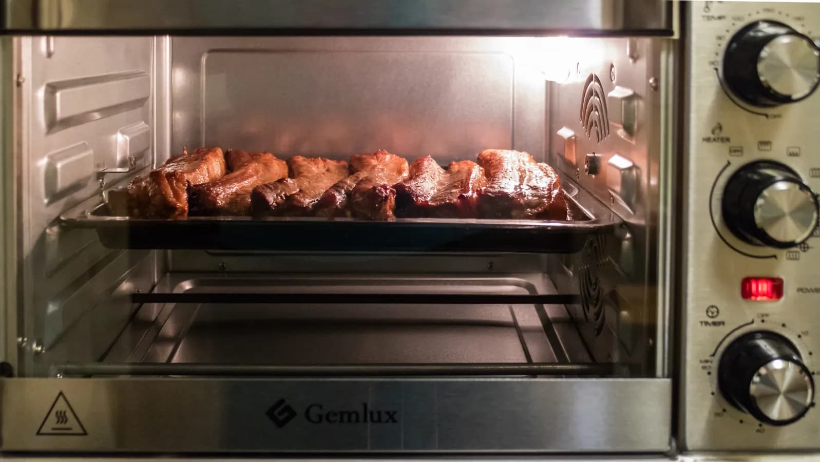Управление печью — электромеханическое, при помощи поворотных переключателей. Верхний устанавливает температуру работы от 60 до 250 °C с шагом в 10 °C; средним выбирается комбинация режимов нагрева (работы тэнов, конвекции, вертела). Нижний регулятор — это таймер, устанавливающий продолжительность работы от 5 до 60 минут с шагом в одну минуту.