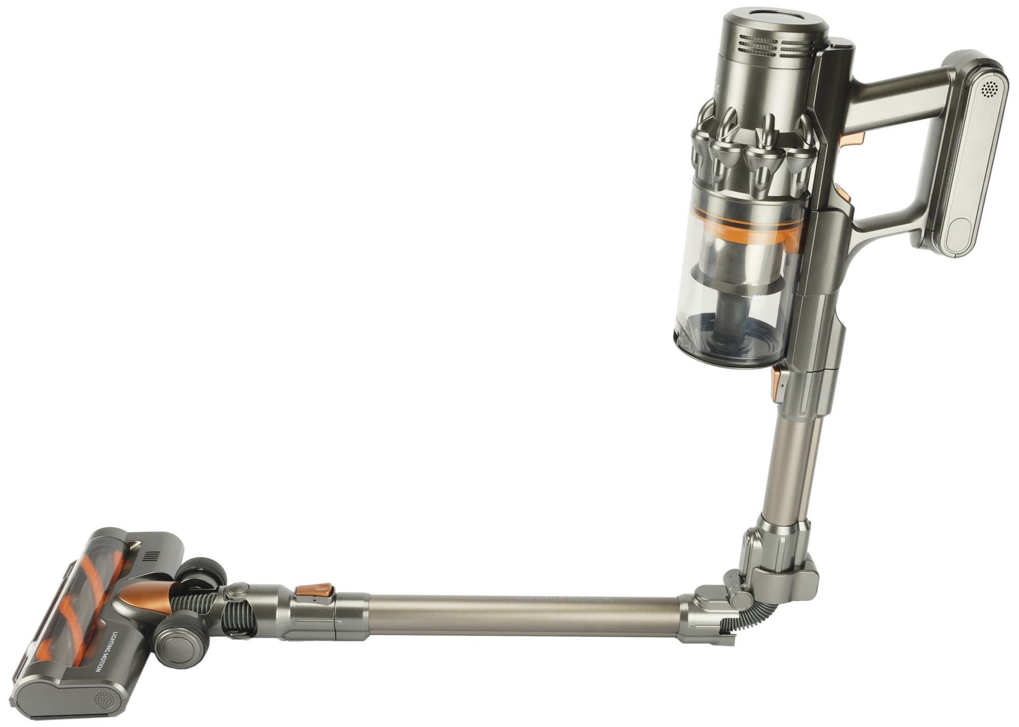 Пылесос с инверторным бесщеточным (BLDC) мотором с потребляемой мощностью 450 Вт и с жидкокристаллическим индикатором зарядки и скорости работы выполнен по продольной схеме: контейнер-циклон установлен параллельно воздушному тракту. Это значит, что поток воздуха с мусором и пылью перед попаданием в контейнер разворачивается на 180°. По этой причине в пылесосах такой конструкции крупный мусор может застревать на входе в пылесборник.