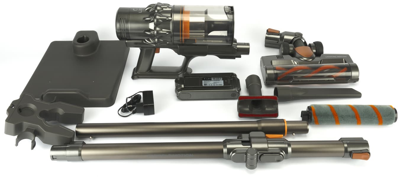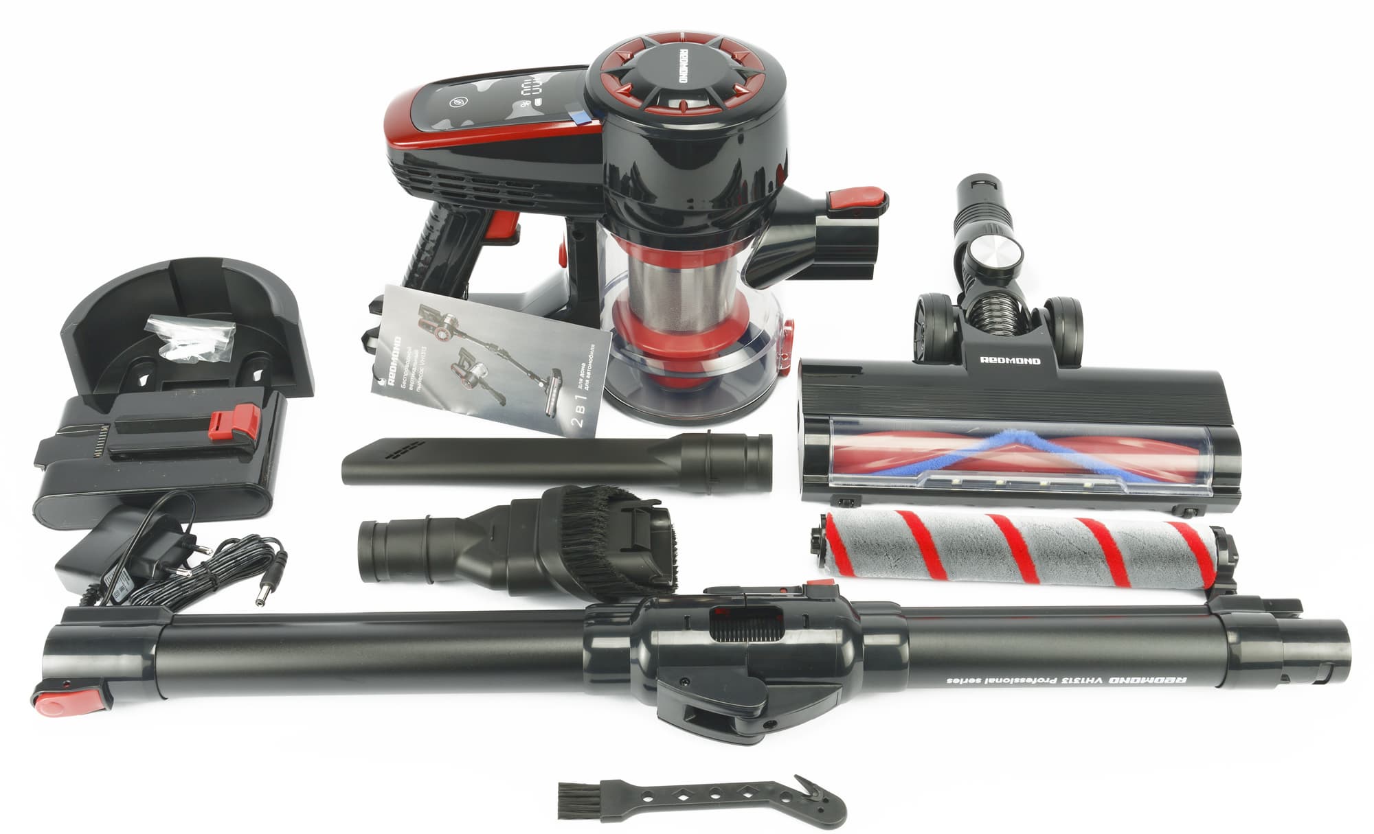 В основной моторизованной насадке предусмотрены два сменных ротора: мягкий для твердых поверхностей, жесткий — для ковров. Остальные насадки обычные: щелевая, для мягкой мебели. Трубка имеет шарнир и складывается почти пополам. В комплект входит стойка для хранения пылесоса и насадок (не для зарядки). Зарядное устройство подключается к моторному блоку отдельно. Заряжать аккумулятор можно на пылесосе и отдельно: он съемный.