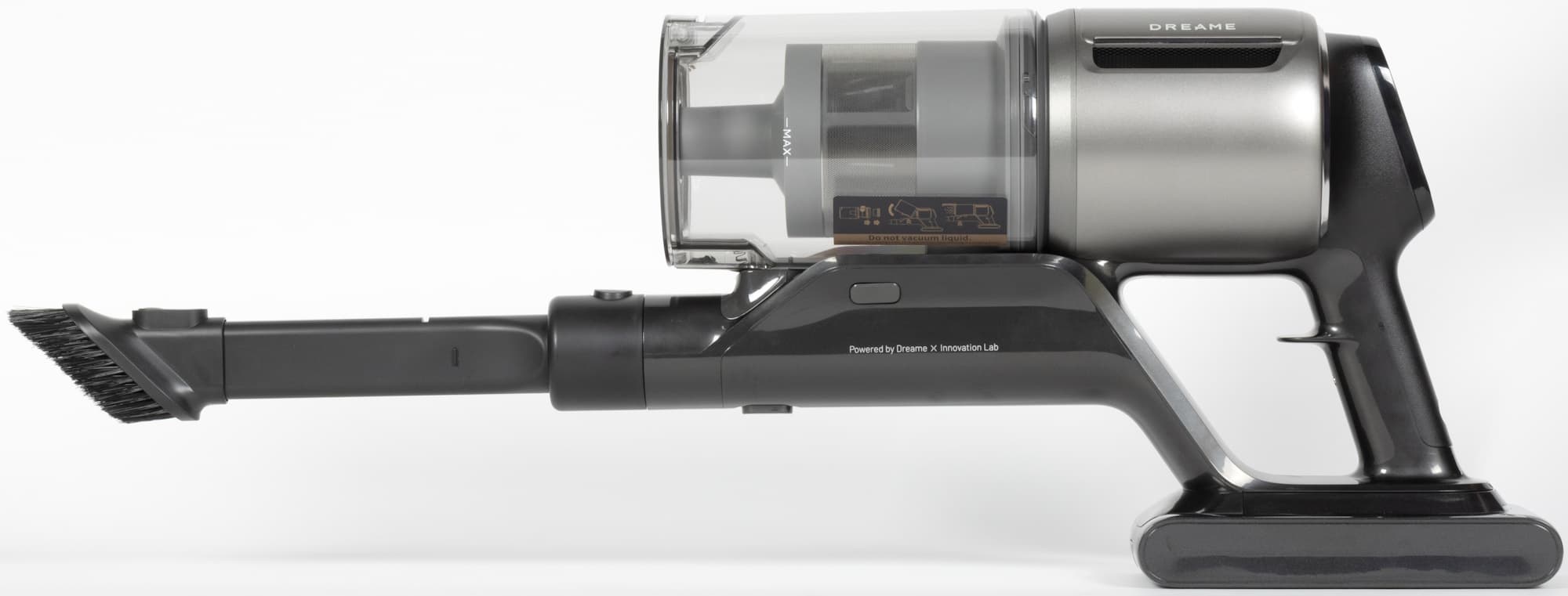 Производитель заявляет мощность всасывания до 310 аВт, наши измерения показали несколько иное, но тем не менее пылесос оказался действительно одним из лидеров по силе всасывания в своей категории. Аккумулятор у модели съемный, но его нельзя заряжать независимо: подключать зарядное устройство нужно напрямую к пылесосу.