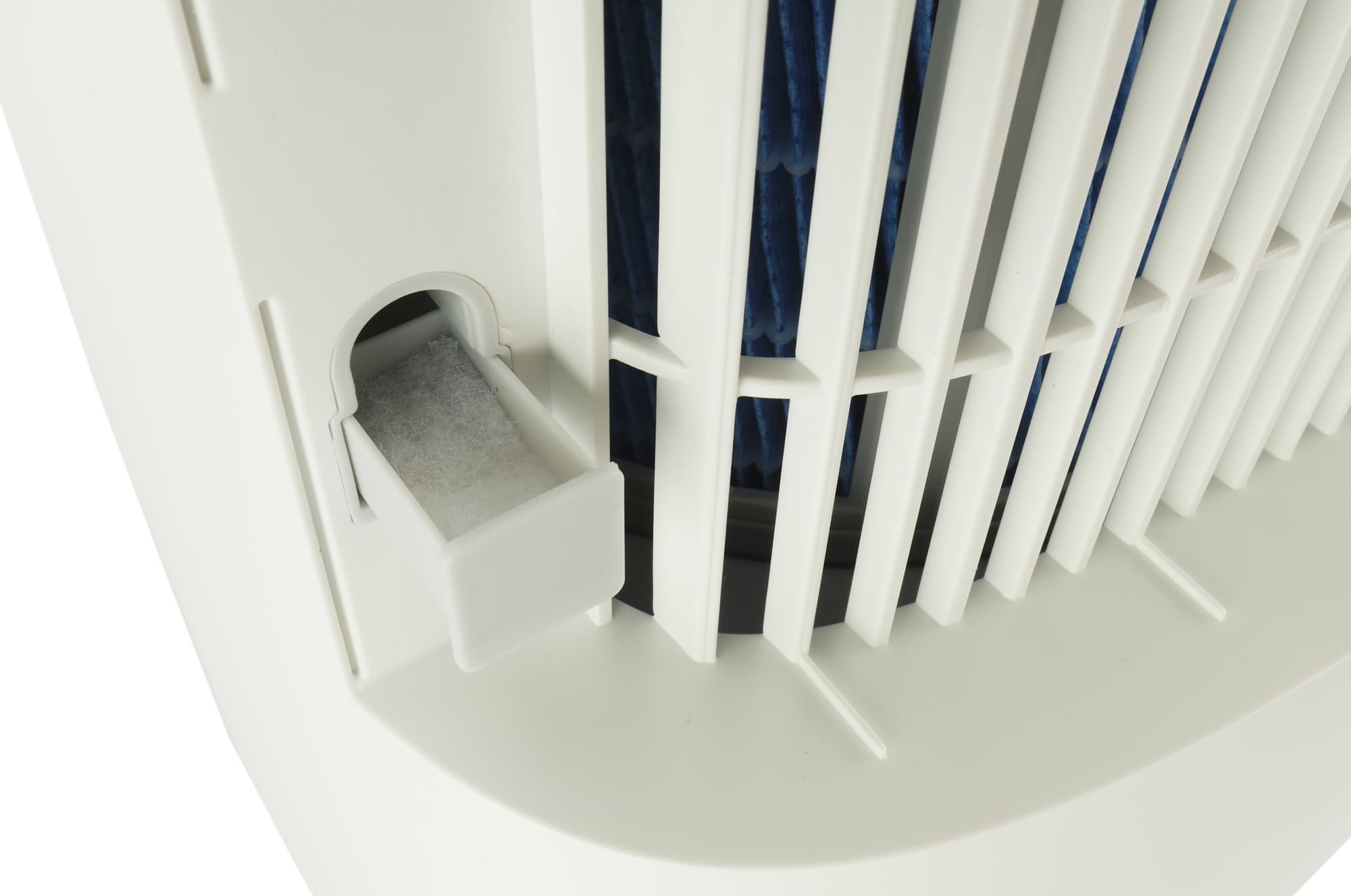 Прибор работает по принципу естественного увлажнения, по сути это такая продвинутая мойка воздуха: воздух попадает в корпус на водяной фильтр — мокрую «гармошку». Воздух увлажняется, очищается от крупной пыли и на выходе дополнительно фильтруется.
