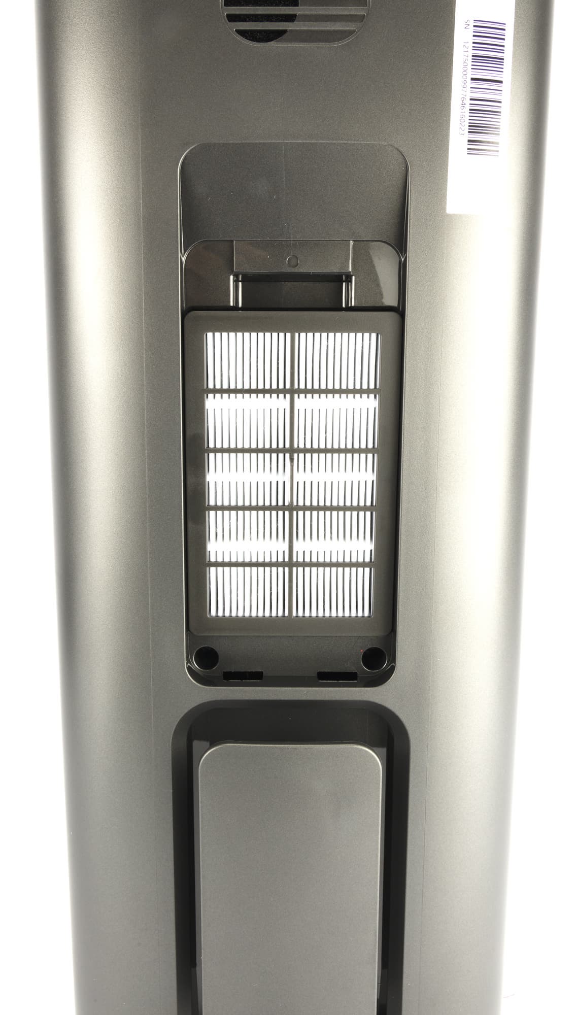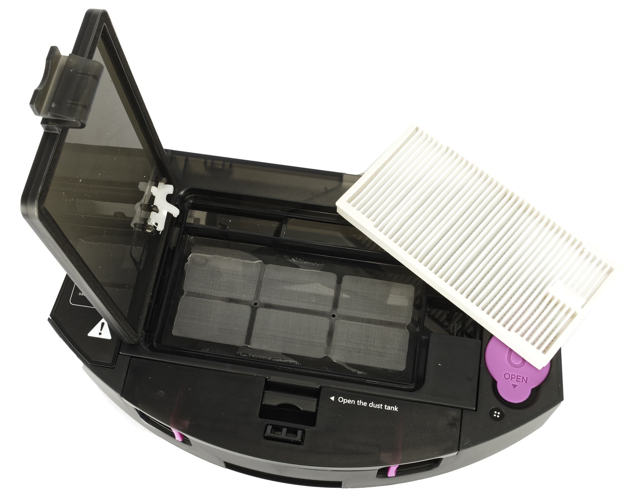 А вот фильтрацию в базе стандартной для робота не назовешь. Под двухслойным фильтром (губка + плотный материал) находится циклон стандартной конструкции, какая часто бывает у аккумуляторных вертикальных пылесосов. Крупные и тяжелые частицы оседают на дне пластикового цилиндра, а среднего размера мусор отделяется пластиковой сеткой перфорацией. Нижняя крышка циклона откидывается, что позволяет опустошить пылесборник без очистки верхних фильтров. Сама база укомплектована НЕРА-элементом для фильтрации исходящего воздуха во время очистки пылесборника робота.