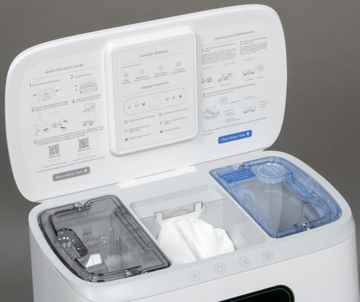 Робот сам заправляется водой (или водой с моющим средством, для которого есть отсек) на станции, в нижней части которой происходит после уборки самоочистка швабр: они автоматически промываются нагретой станцией же водой, вытираются о специальную рамку и высушиваются теплым воздухом. Система очистки съемная, ее можно дополнительно промыть вручную при необходимости.