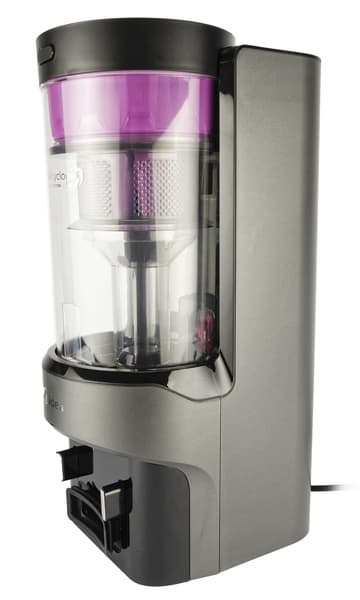 Такого технического решения удаления собранного мусора из пылесборника в базу мы еще действительно не встречали прежде. Вместо большого мешка для сбора мусора в этой модели в базе находится циклоническая система, которая фильтрует и собирает мусор в пластиковый контейнер. Таким образом, пользователь избавлен от необходимости покупать мешки. Правда, признательность покупателя за эту экономию заложена, по всей видимости в стоимость модели — выше среднего, что нехарактерно для приборов бренда.