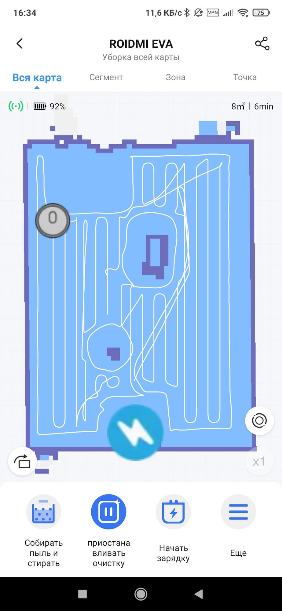 В процессе уборки робот в основном ездит сначала по периметру помещения, а затем — змейкой по всему доступному пространству. После уборки на карте появляются «грязные зоны», где, по мнению робота, нужна повторная уборка, которую можно запустить или настроить автоматический запуск.
