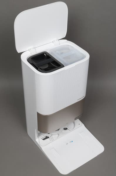 База служит для зарядки, удаления сухого мусора, заправки внутреннего резервуара пылесоса чистой водой, стирки и сушки мопов теплым воздухом. Пользователь должен вовремя менять мешки для мусора, заливать в одну емкость чистую воду и выливать из другой грязную.