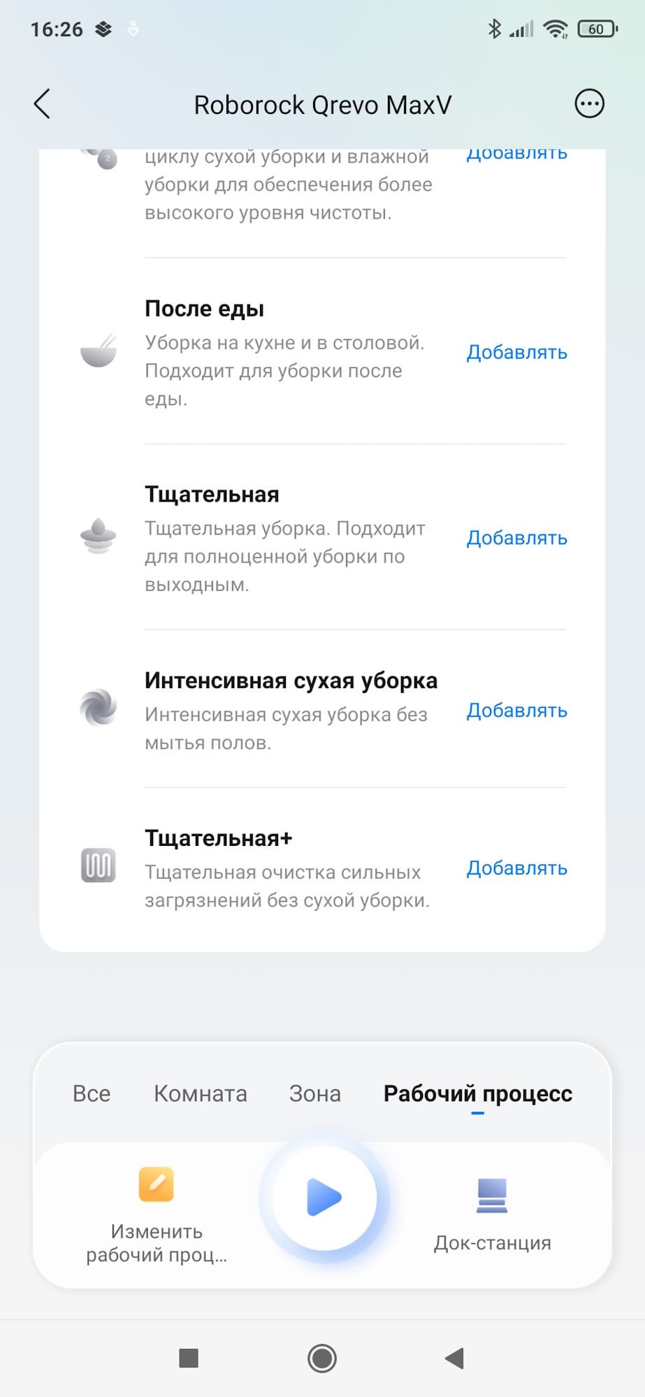Управлять роботом лучше через приложение с огромным количеством функций и настроек поведения робота и параметров уборки. Но для тех, кто не хочет в них вникать, есть умный режим, который настроит всё самостоятельно, останется немного отредактировать то, что не подходит, добавить полный цикл уборки, уборку комнаты или выбранной зоны. Для каждого режима можно настроить тип уборки (сухая, влажная, комбинированная), количество проходов, интенсивность работы при прохождении маршрута, мощность всасывания, количество подаваемой воды и т. п. В общем, настроить можно что угодно: несколько уборок одного типа, разных типов, пройти зону несколько раз.
