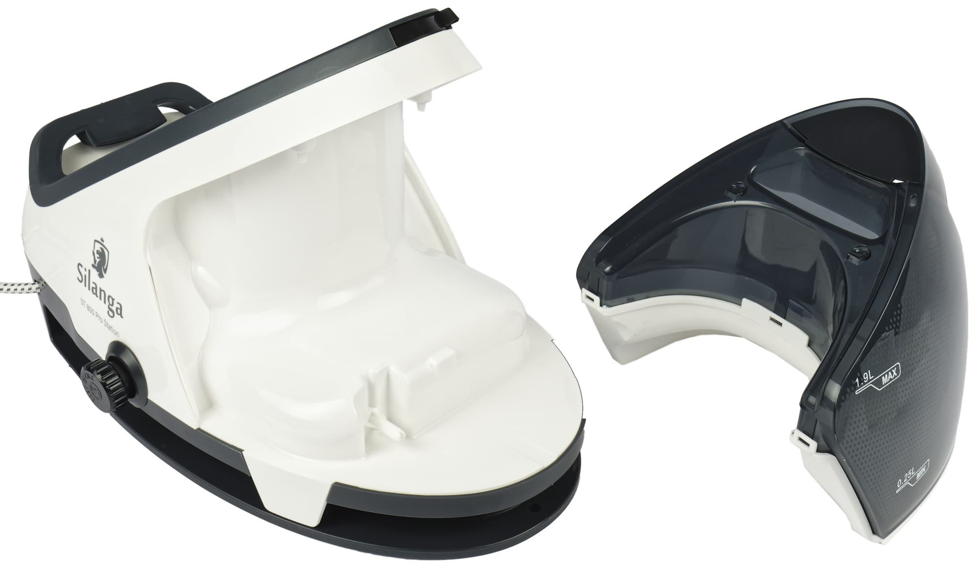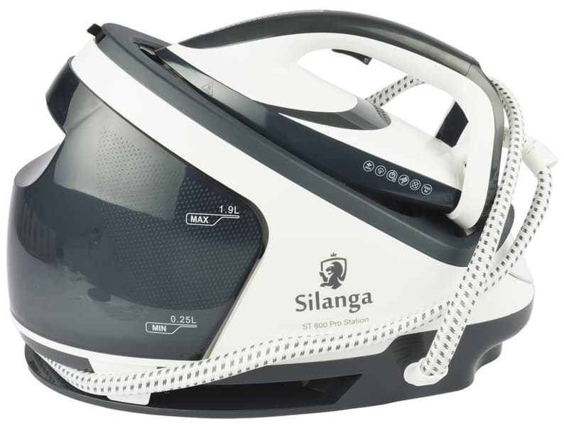 Один из самых мощных (кстати, показания ваттметра практически совпали с данными технической документации), стильных и удобных парогенераторов, побывавших в нашей лаборатории. Отличное качество сборки, простое понятное управление, большой резервуар для воды — все сделано по уму. Модель работает в минимальном и максимальном режимах, к каждому из которых можно добавить опцию «эко» для уменьшения потребления электричества при сохранении эффективности работы. Возможно сухое глажение, с паром и вертикальное отпаривание. Индикатор нехватки воды сообщает о необходимости долива, индикатор необходимости очистки от накипи — соответственно, об этой процедуре, хотя производитель рекомендует заливать в резервуар дистиллированную воду. Через 10 минут бездействия в любом режиме парогенератор автоматически отключается.