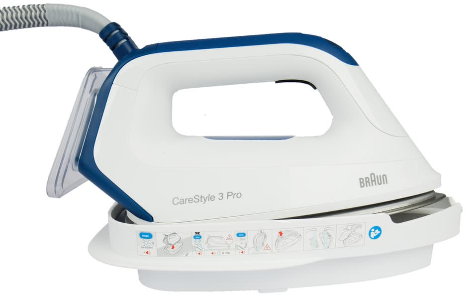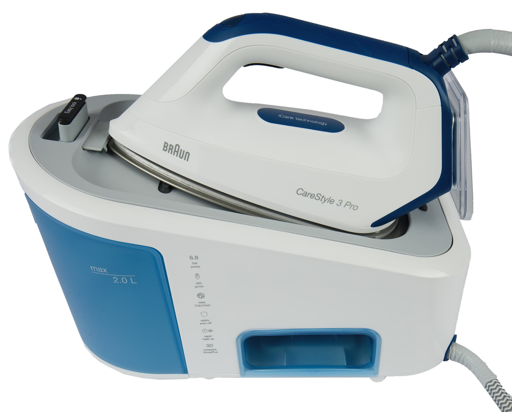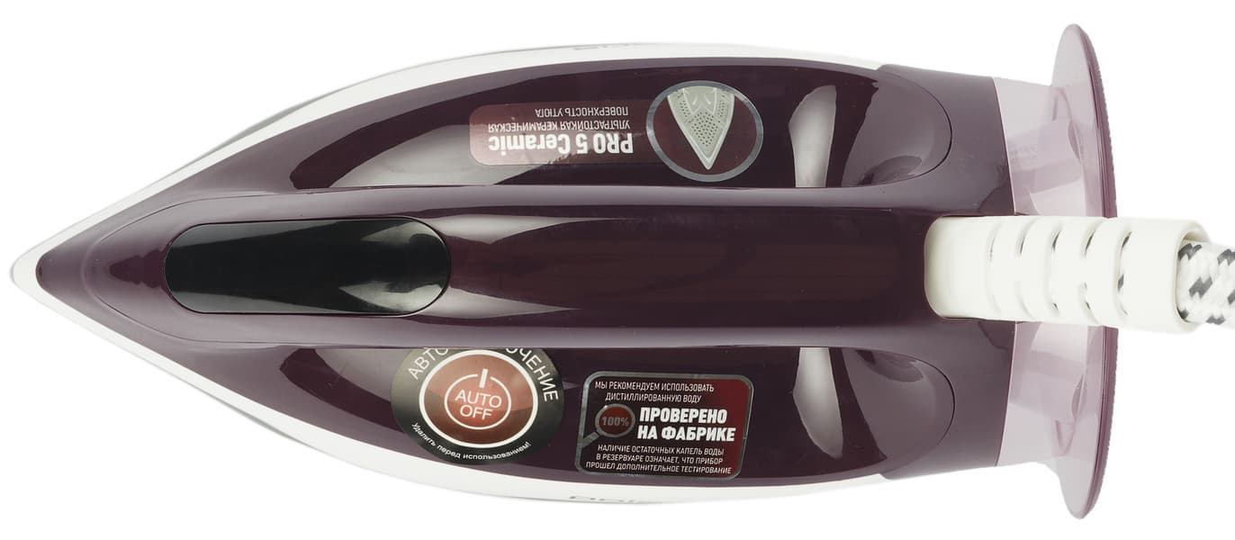 Популярная модель, которая спустя два с половиной года после нашего обзора все еще активно продается в РФ. Несмотря на некоторые вопросы к работе прибора, он понравился тестировщикам. Фишка модели — запатентованная форма подошвы утюга, похожая на скейтборд: за счет закругленного задника гладить можно и вперед, и назад, не опасаясь появления заломов и складок, и мы действительно оценили удобство такой конструкции во время практических тестов. Кроме того, у этой модели самый большой резервуар для воды объемом 2 л.