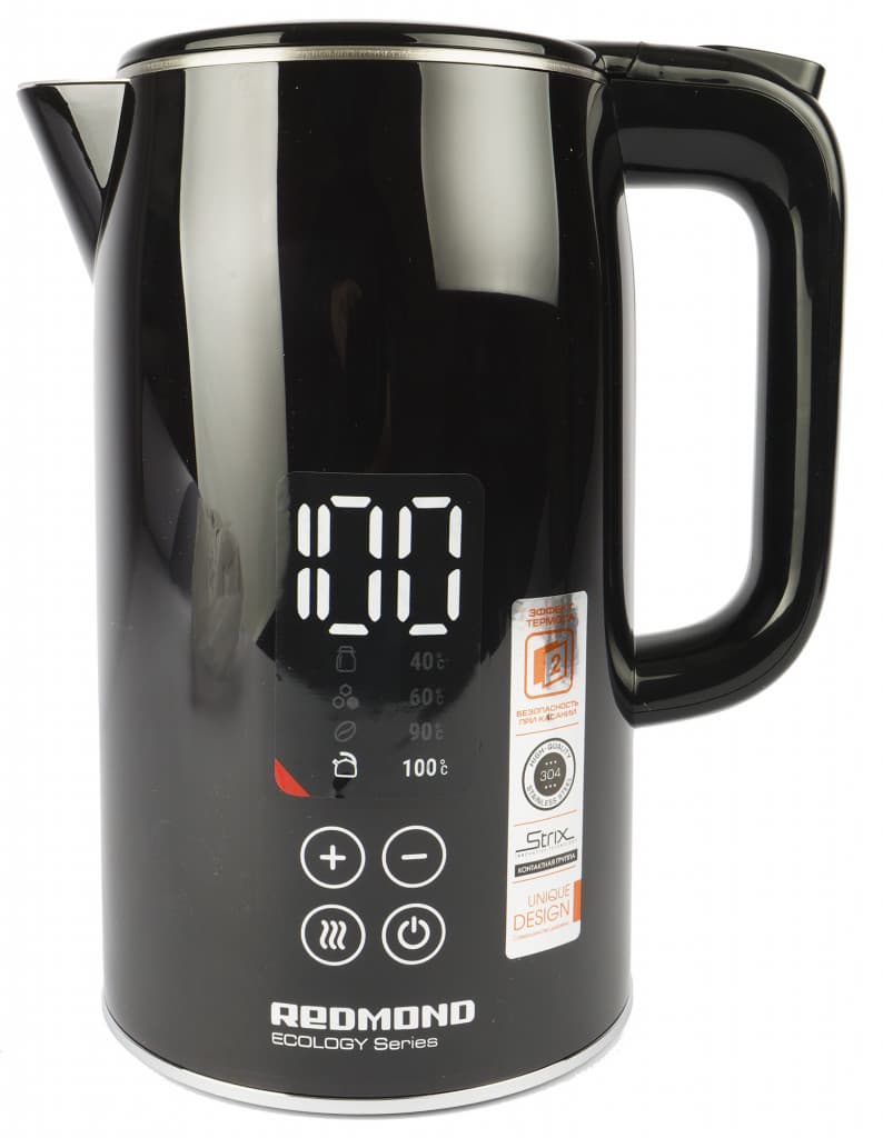 Продвинутая модель, которую мы проверяли с пристрастием: столько функций и необычная панель управления прямо на корпусе! Чайник не только доводит воду до кипения, но и нагревает ее до 40, 60, 90 градусов, так что его удобно использовать для приготовления мате, зеленого чая, детских смесей, спортивного питания, а также для запаривания трав. После нагрева до нужной температуры чайник переходит в режим автоподогрева, в котором остается 4 часа, если его не выключить — для этого нужно просто снять чайник с базы. У модели адиабатный корпус с полым изолирующим слоем между внутренними и внешними стенками, что создает эффект термоса: сохраняя тепло воды внутри колбы и не давая сильно нагреваться внешним стенкам чайника. Картину продуманности и надежности завершает британский контроллер Strix.