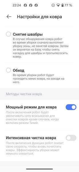 Система распознавания поверхности помогает роботу бережно относиться к ковровым покрытиям, поведение робота в таких случаях можно точно настроить в приложении. Например, заезжая на ковер, пылесос приподнимает швабры или вернется на базу, снимет их и продолжит уборку в сухом режиме.